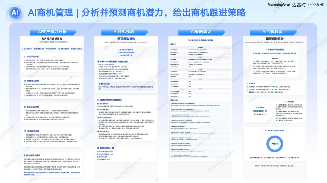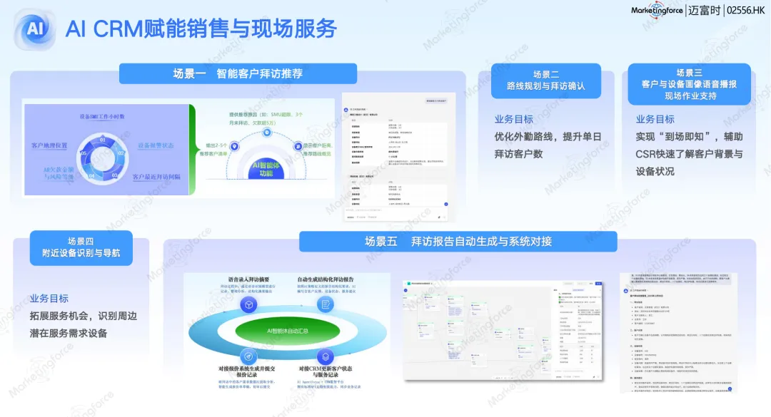 在化工能源行业,通过“AI防窜货天网”场景,结合扫码数据与物流轨迹智能分析,试点客户窜货率下降超60%,年均挽回损失数千万元。 在创新药行业,通过“AI目标动态分解与穿透分析”场景,实现了从大区到医药代表、从产品组到具体品规的四维业绩管理,目标制定更科学,过程管理更透明。 在工程机械行业,通过“AI拜访报告自动生成与服务建议”场景,售后工程师现场即可完成结构化数据录入,AI自动生成服务报告与配件采购建议,将数据回流与客户响应效率提升了一倍以上。