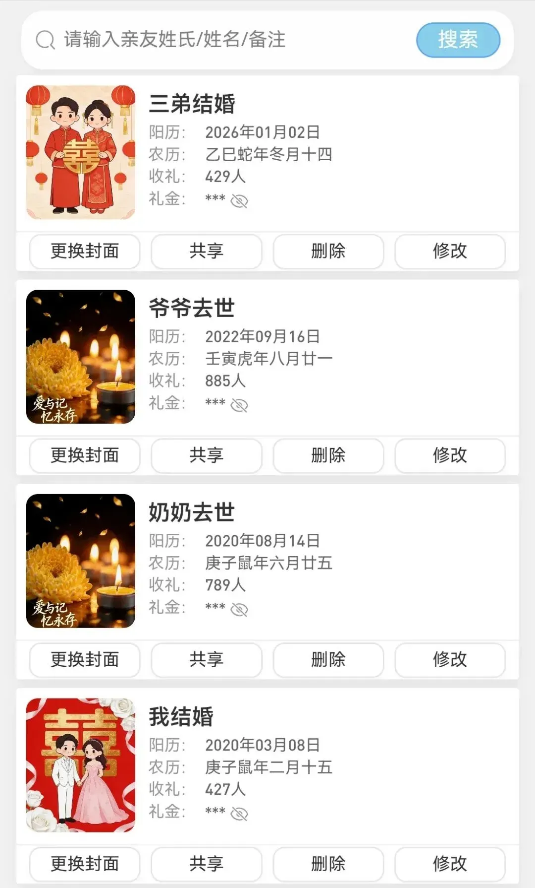 · 可创建多个收礼簿(封面可上传真实照片),录入后通过姓名快速查询往来记录。