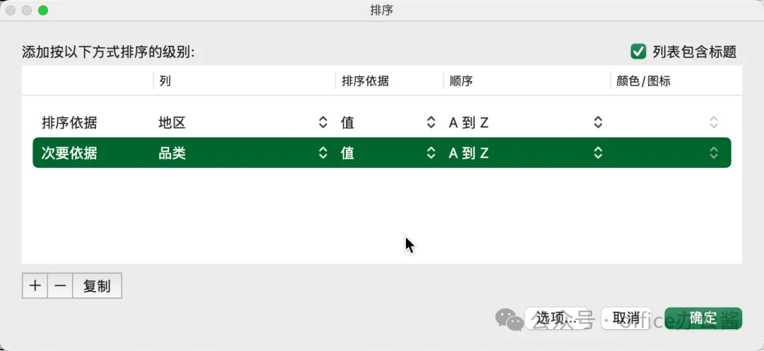 2、按主要关键字(如"地区")排序,再按次要关键字(如"产品类别")排序