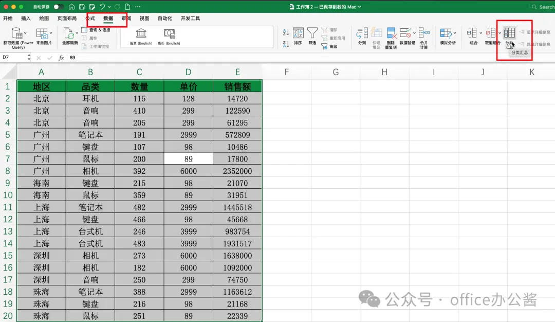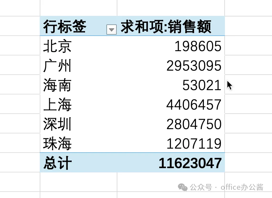 以按"地区"汇总销售额为例: