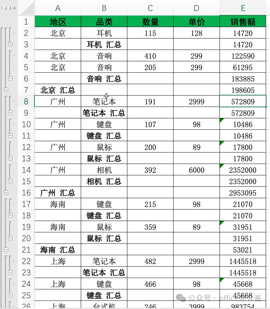 1、 先按"地区"进行一级分类汇总(方法同上)