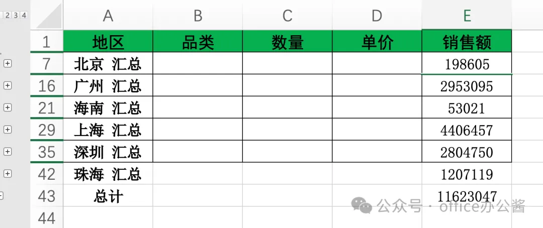 3、点击确定,即可看到按地区汇总的销售额。可以看到数据会自动按地区分组,并在每组下方显示汇总结果,同时左侧会出现分级显示符号(1、2、3),方便折叠和展开数据。