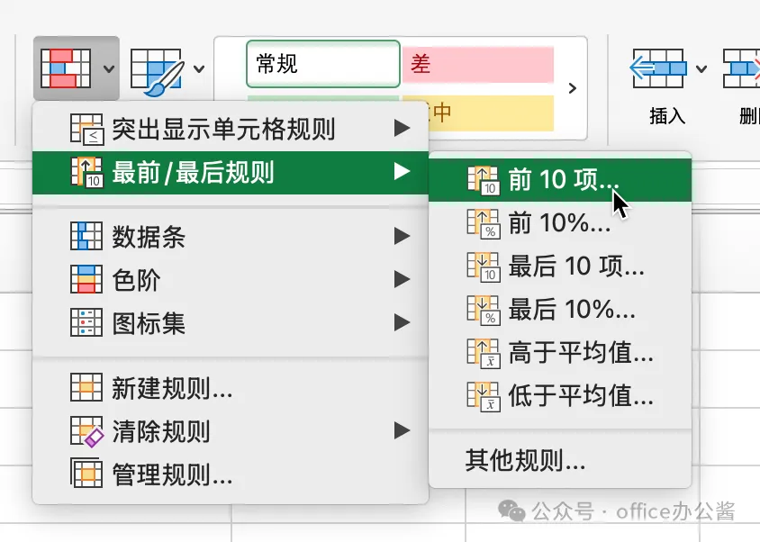 2、点击开始选项卡 → 选择条件格式 → 设置颜色规则(如将TOP3汇总行标记为绿色)