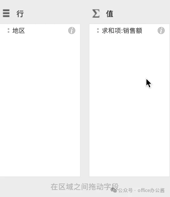 2、将"地区"拖入行区域,将"销售额"拖入值区域。