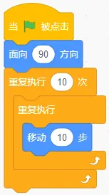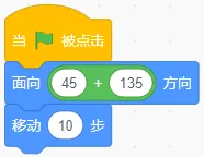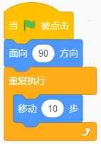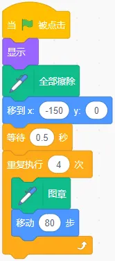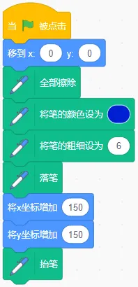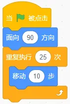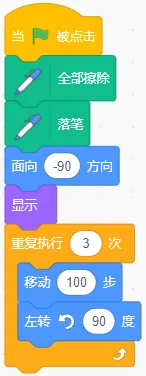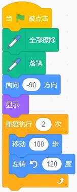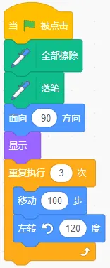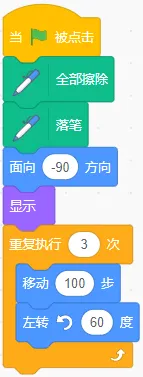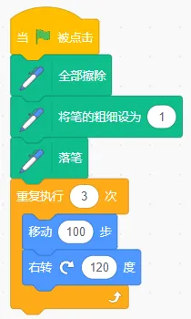 34.角色位于舞台的正中心,面向90方向,笔的颜色为蓝色,运行下列程序后,画出的轨迹是三角形。()