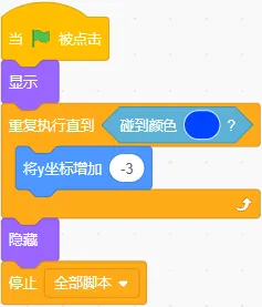 试题解析:苹果初始状态为显示,重复执行将y坐标增加-3,直到碰得蓝色,则苹果为隐藏状态,然后停止全部脚本。所以苹果往下落,当碰到蓝色时候就不见了。
