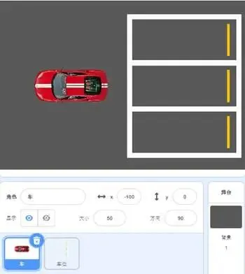 10.现有“车”和“车位”两个角色,角色初始位置如下图所示,运行一次程序,模拟倒车入库的过程,①处应填写?()