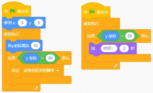 试题解析:执行图中的脚本后,角色的 y 坐标的数值会一直增大,当 y 坐标的值大于 50 的时候,就会执行【停止该角色其他脚本】这个语句,右边的脚本就会停止运行,所以角色不会说出“你好!”,左边的代码还是会继续运行,角色一直向上移动。正确答案是 D。