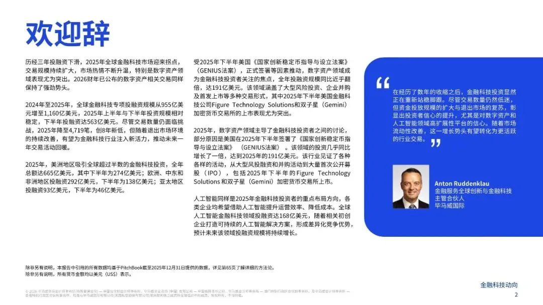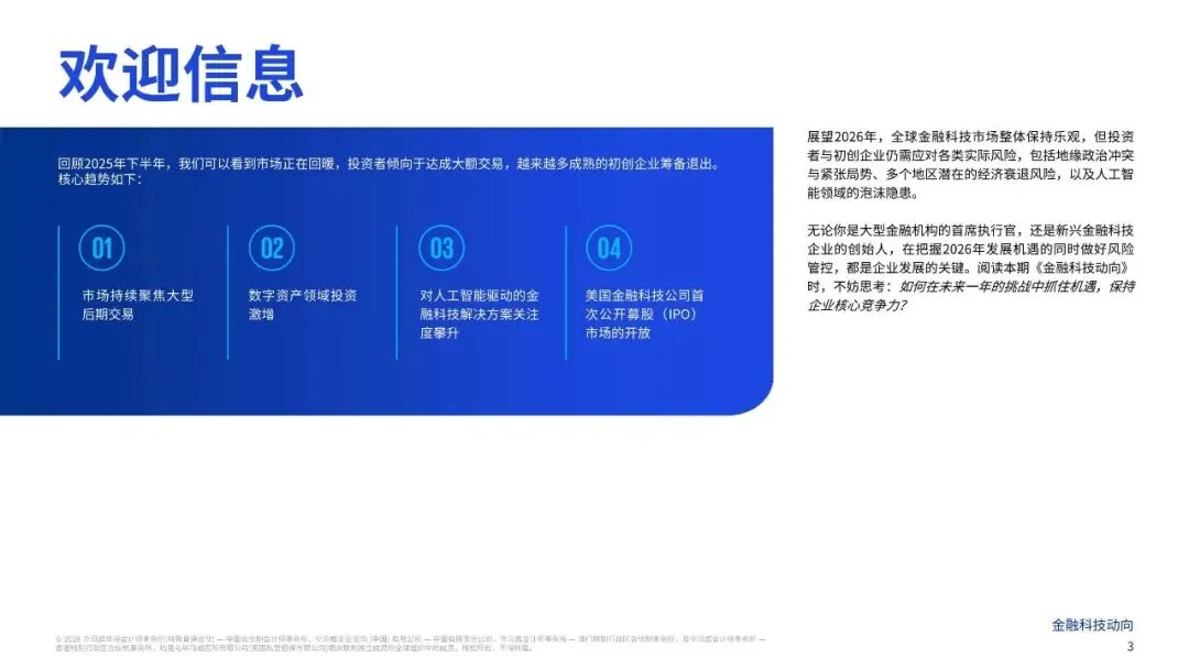 历经三年投融资下滑,2025年全球金融科技市场迎来拐点,交易规模持续扩大,市场热情不断升温,特别是数字资产领域表现尤为突出。2026财年已公布的数字资产相关交易同样保持了强劲势头。
