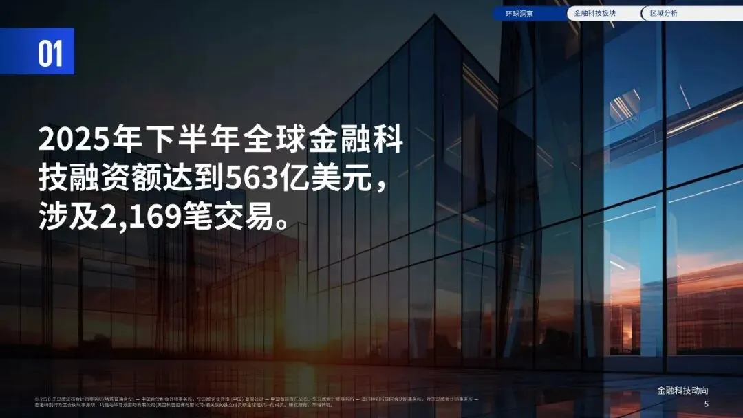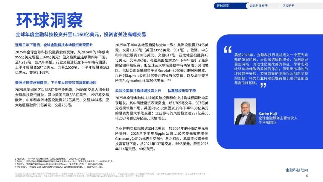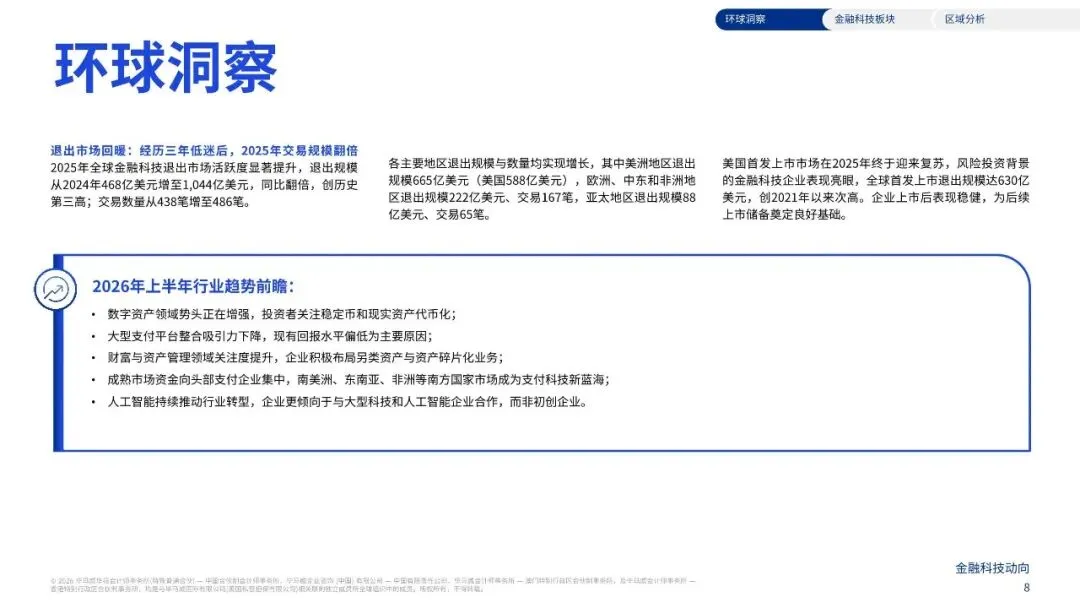 2024年至2025年,全球金融科技专项投融资规模从955亿美稳定 元增至 ,下半年投融资达 1,160亿美元,2025 563亿美元 年上半年与下半年投资规模相对 。尽管交易数量仍面临挑战, 的持续改善 2025年降至4, ,有望为金融科技行业注入新活力 719笔,创8年新低,但随着退出市场环境 ,推动未来一年交易活动回暖。