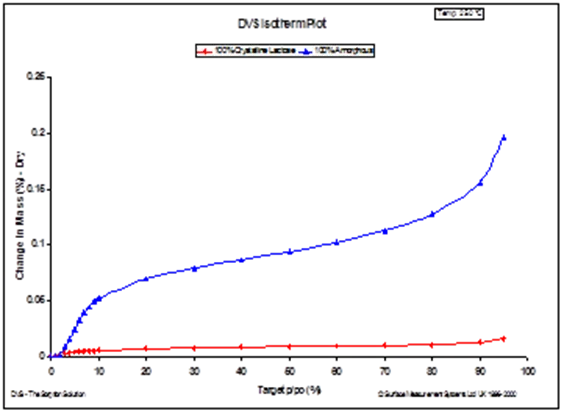 图1. 100%结晶乳糖和100%无定形乳糖的辛烷吸附等温线