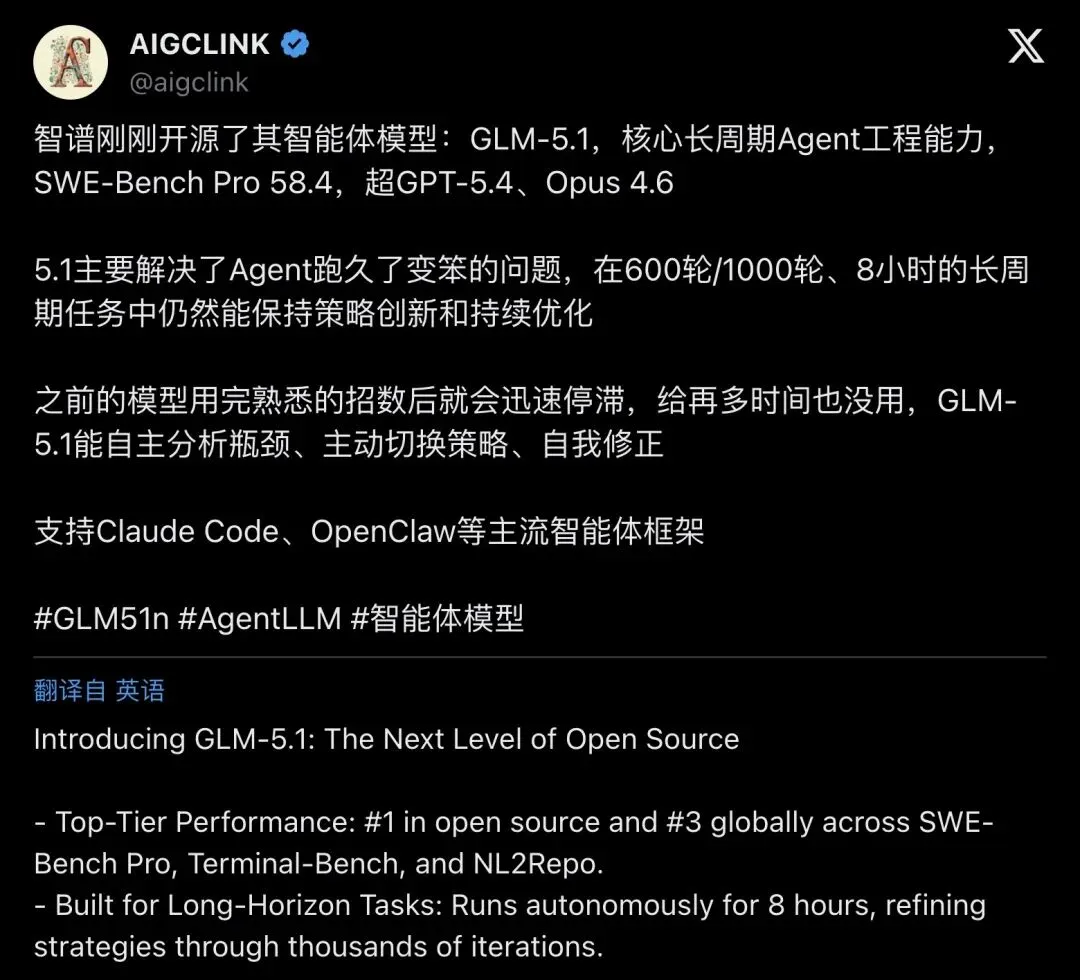 ▲ AIGCLINK推文总结:GLM-5.1主打解决「Agent跑久变笨」问题(9.2K次查看)