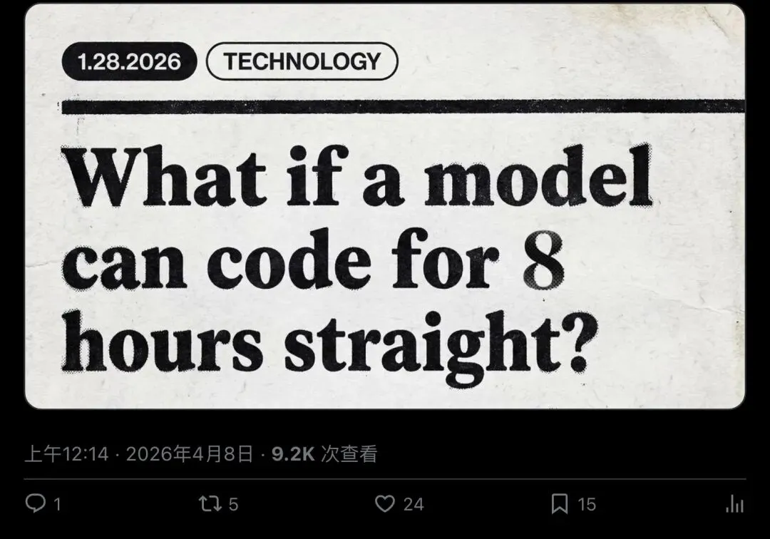 过去我们评估AI模型,看的是「单次回答有多准」。但在Agent时代,真正重要的问题变了:当任务需要跑几百轮、甚至跑8个小时的时候,你的模型还行不行?