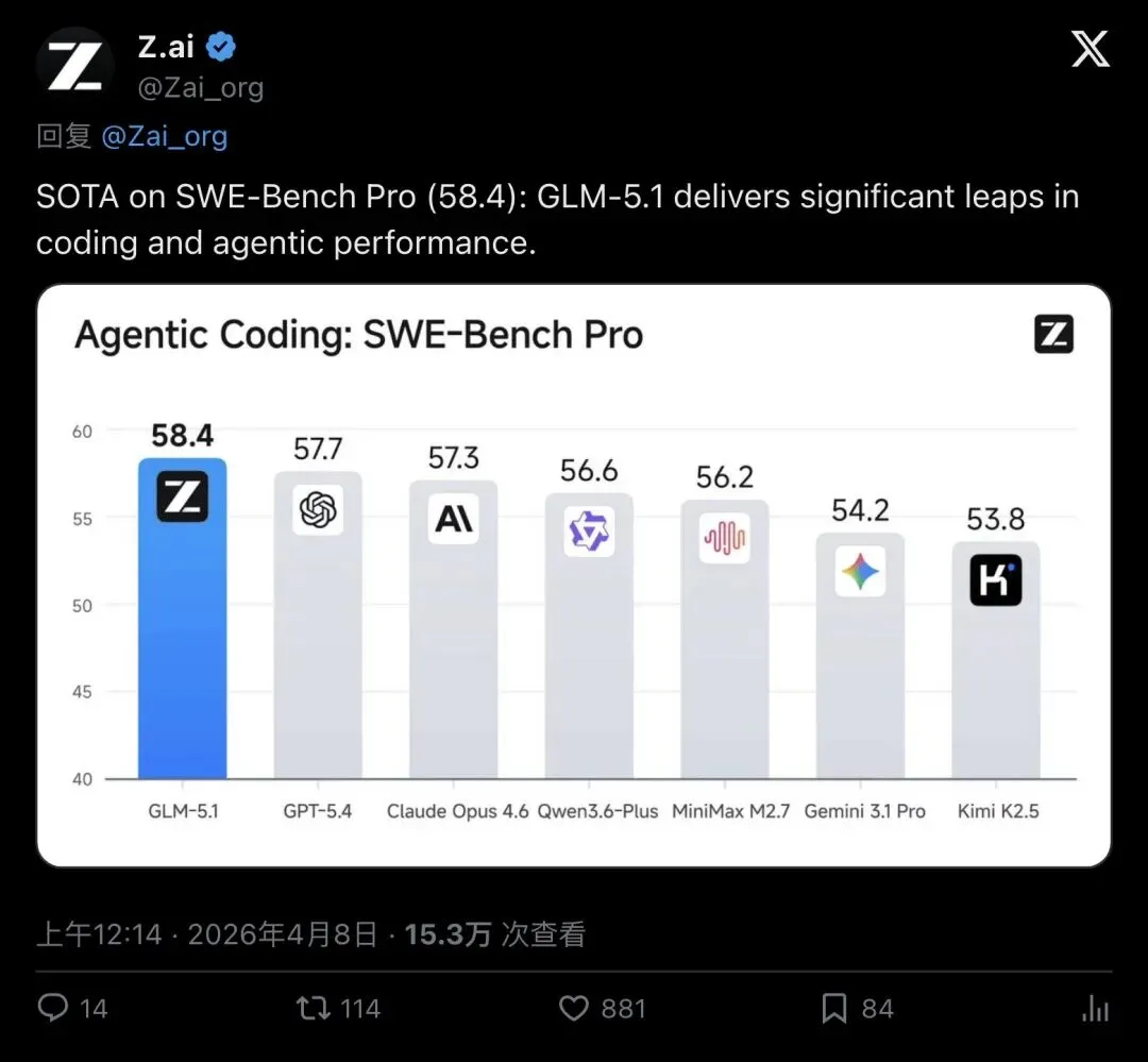 ▲ Z.ai官方推文:GLM-5.1在SWE-Bench Pro上以58.4分登顶(15.3万次查看,881赞)