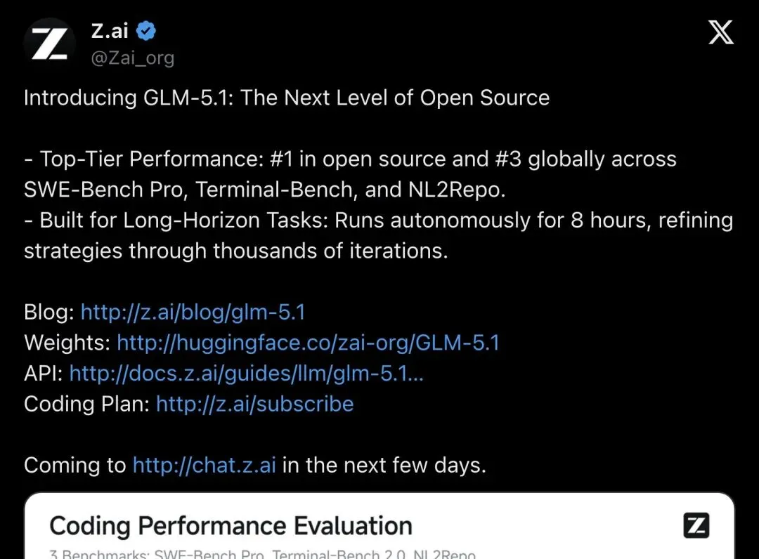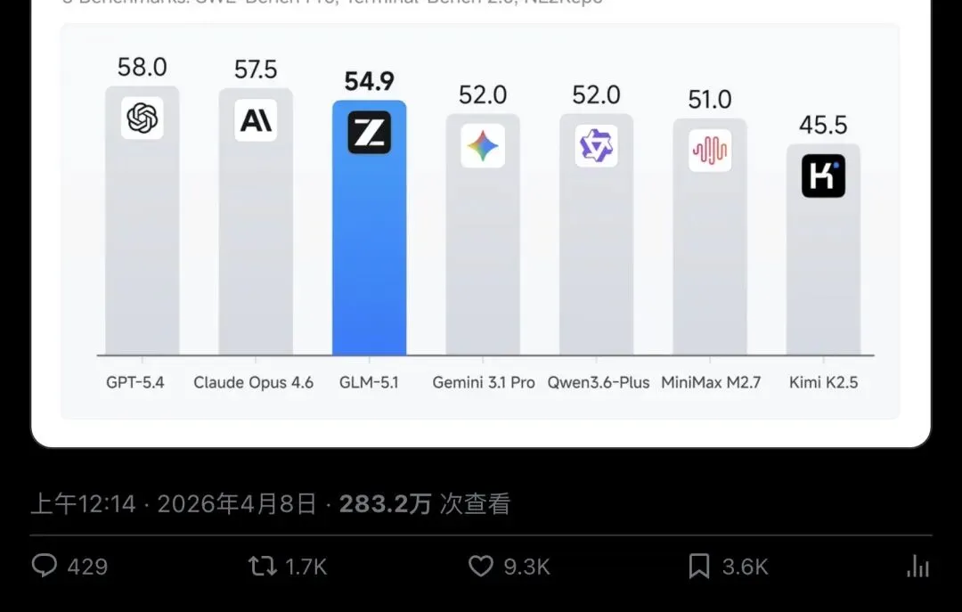 ▲ Z.ai官方主贴:综合三大编码基准,GLM-5.1排名全球第三、开源第一(283.2万次查看,9.3K赞)