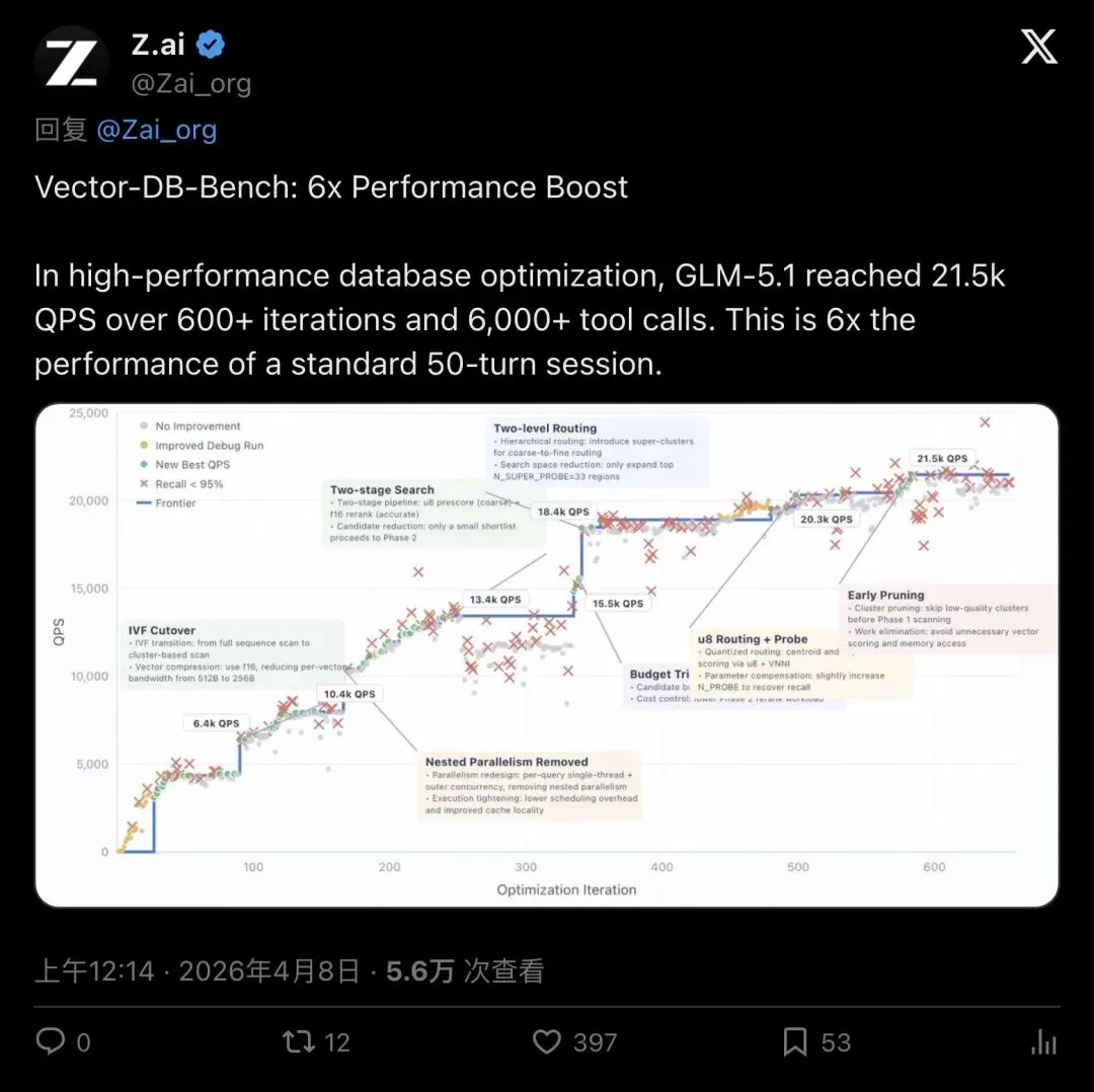 ▲ Z.ai官推:VectorDBBench场景下GLM-5.1实现6倍性能提升(5.6万次查看,397赞)