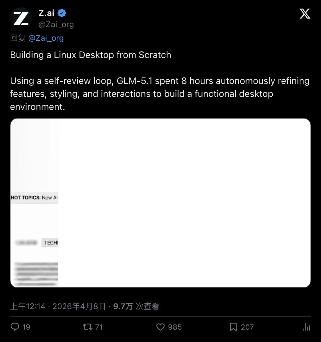 ▲ Z.ai官推:GLM-5.1用8小时自主构建了一个完整的Linux桌面环境(9.7万次查看,985赞)