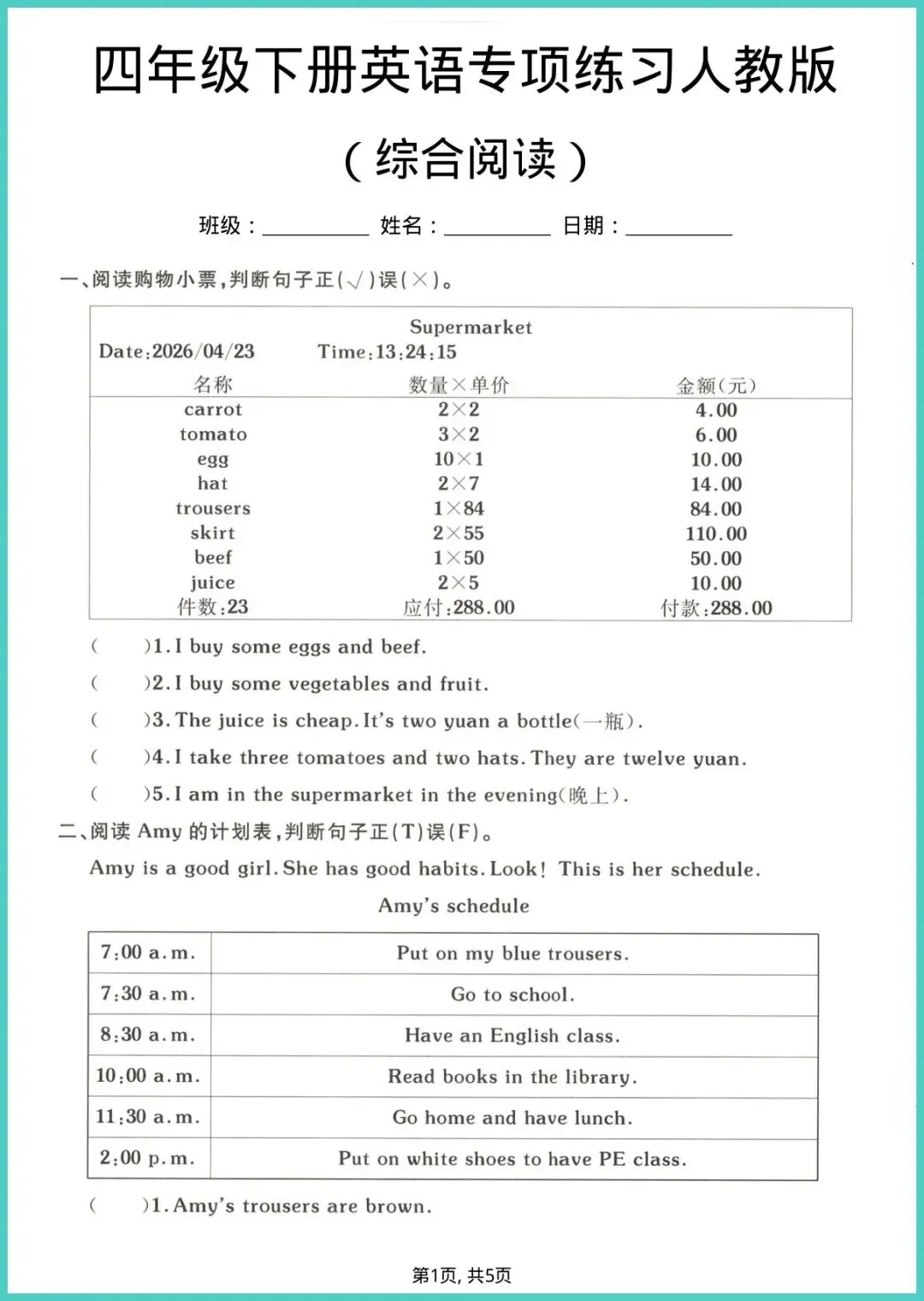 2026春人教版四年级下册英语《综合阅读专项练习》新鲜出炉!5页精华,紧贴课本话题,涵盖故事、对话、科普小短文,配高频词汇表答题技巧框,带孩子一遍读透、二遍抓关键词、三遍提速不失分。每天10分钟,语感、词汇、理解力同步飞,期末阅读拿满分不再难!家有四年级娃的爸妈,赶紧打印出来,让孩子练起来,好资源不等人!
