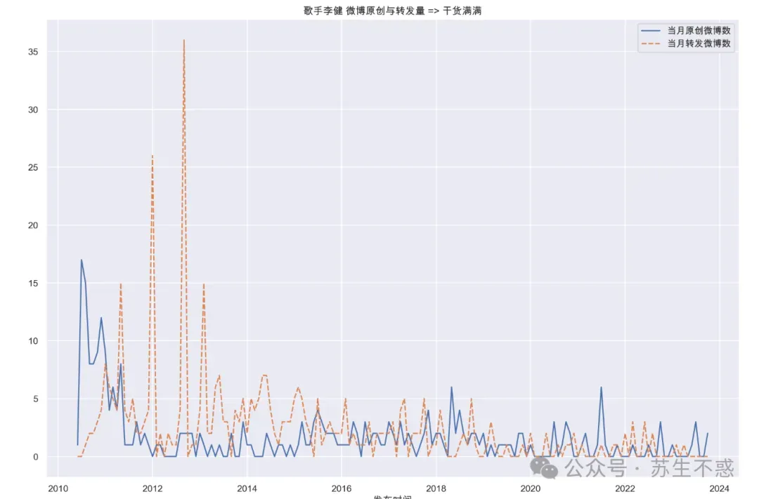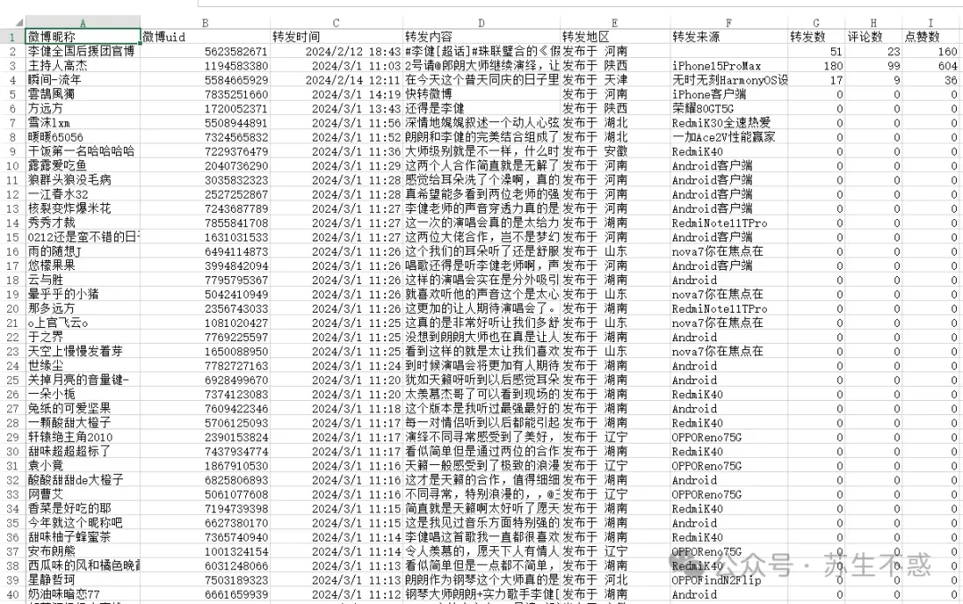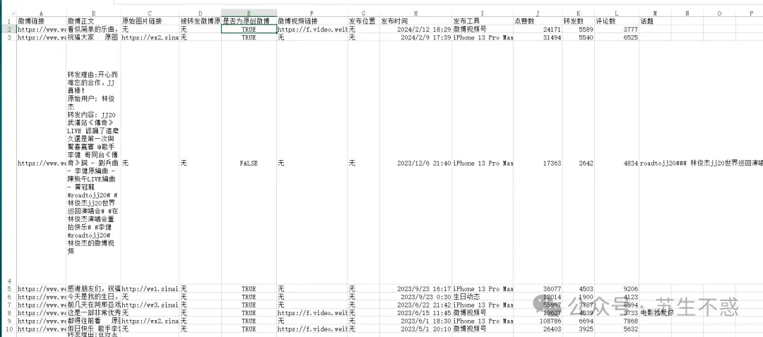 以李健这个号为例 https://weibo.com/n/歌手李健 解放双手,微博新工具来了 ,共抓取727条微博,导出的excel微博数据包含微博链接,微博正文,原始图片链接,被转发微博原始图片链接,是否为原创微博,微博视频链接,发布位置,发布时间,发布工具,点赞数,转发数,评论数,话题等。
