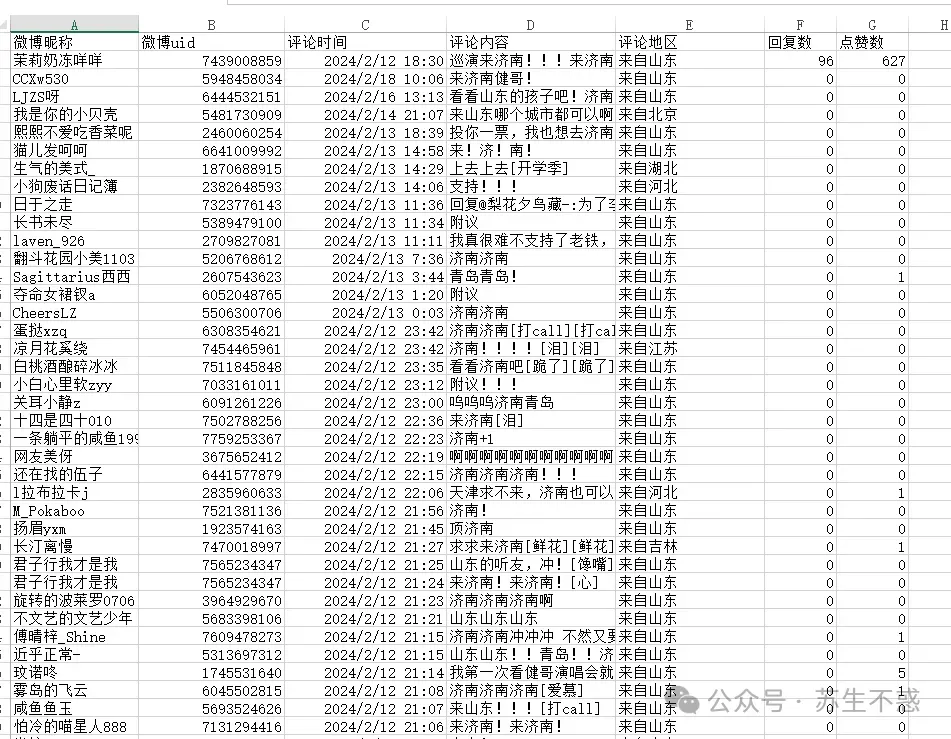 导出的excel数据包含每条评论的微博昵称,微博uid,评论时间,评论内容,评论地区,回复数,点赞数等。