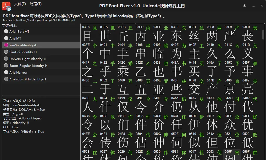 软件使用方法:1、文件菜单打开PDF。或者直接拖拽文档到软件窗口。2、点击字体名称,查看字体属性,是否嵌入。本软件只处理嵌入字体,不处理Type3类型的pdf自绘字体。3、按F4,识别右侧窗口中渲染出来的全部字符。点击字符图像可以人工校正。具有插入、删除、修改、修改并继续,等多个功能。4、按F2,保存当前字体的Unicode映射。5、如此循环,处理全部需要补充映射的字体。6、文件菜单--保存PDF运行环境:1、由于使用最新的Direct2D构建UI,操作系统要求Windows 22H2或更高,64位操作系统。并安装最新补丁。2、需要CPU支持SSE4.2、AES、AVX2指令集,否则本软件无法启动。3、需要显卡支持DirectX 11, Direct 2D。4、由于OCR比较吃CPU和内存,运行速度与CPU和内存大小有关。电脑配置不要低于8G内存。处理大量字体建议32G内存。5、不支持Windows7、8、vista和早期的Windows10版本(低于1809)。6、不支持32位操作系统。