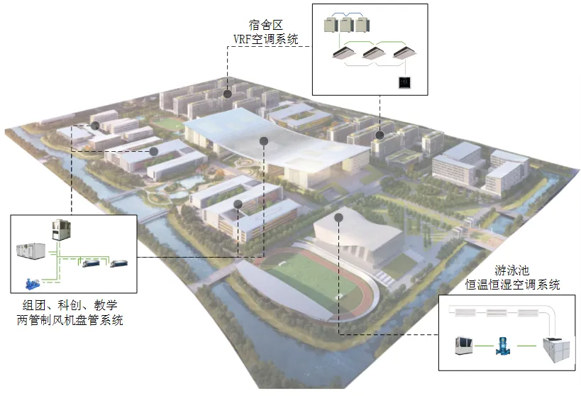 本项目暖通工程主要包括:冷、热源系统、空调风系统、空调水系统、通风系统等。南、北宿舍区采用VRF多联空调系统,游泳池使用三集一体除湿热泵机组,并设置恒温恒湿空调系统,其余建筑工程采用冷凝热泵机组为冷热源的两管制风机盘管系统。暖通工程概况见图18.23-1。
