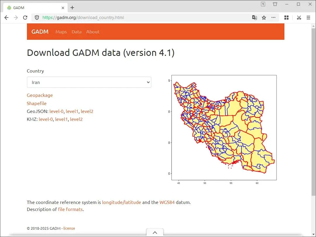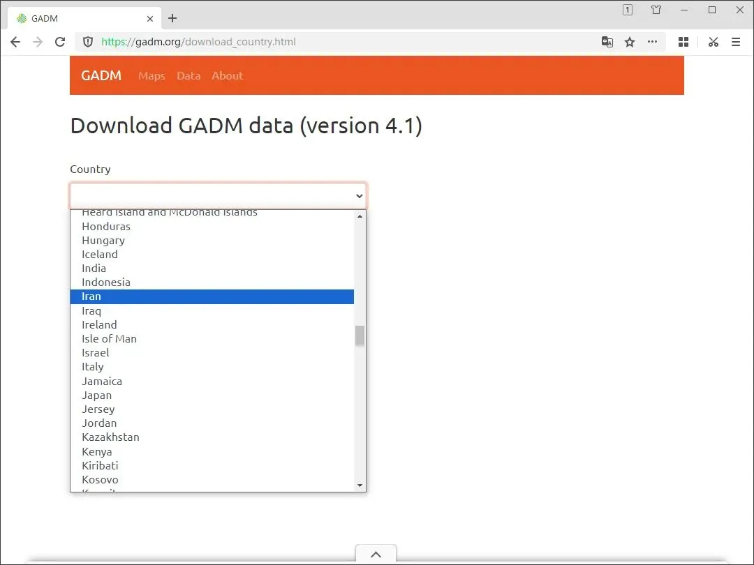 在国家列表中选择“Iran”,你也可以选择需要下载行政区划的其它国家。