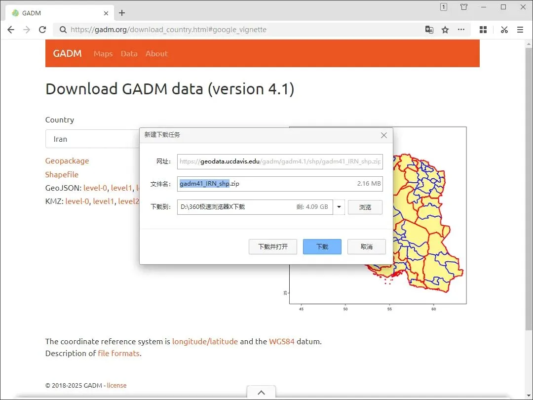 这里我们以下载Shapefile为例,点击后可以开始下载伊朗的行政区划。