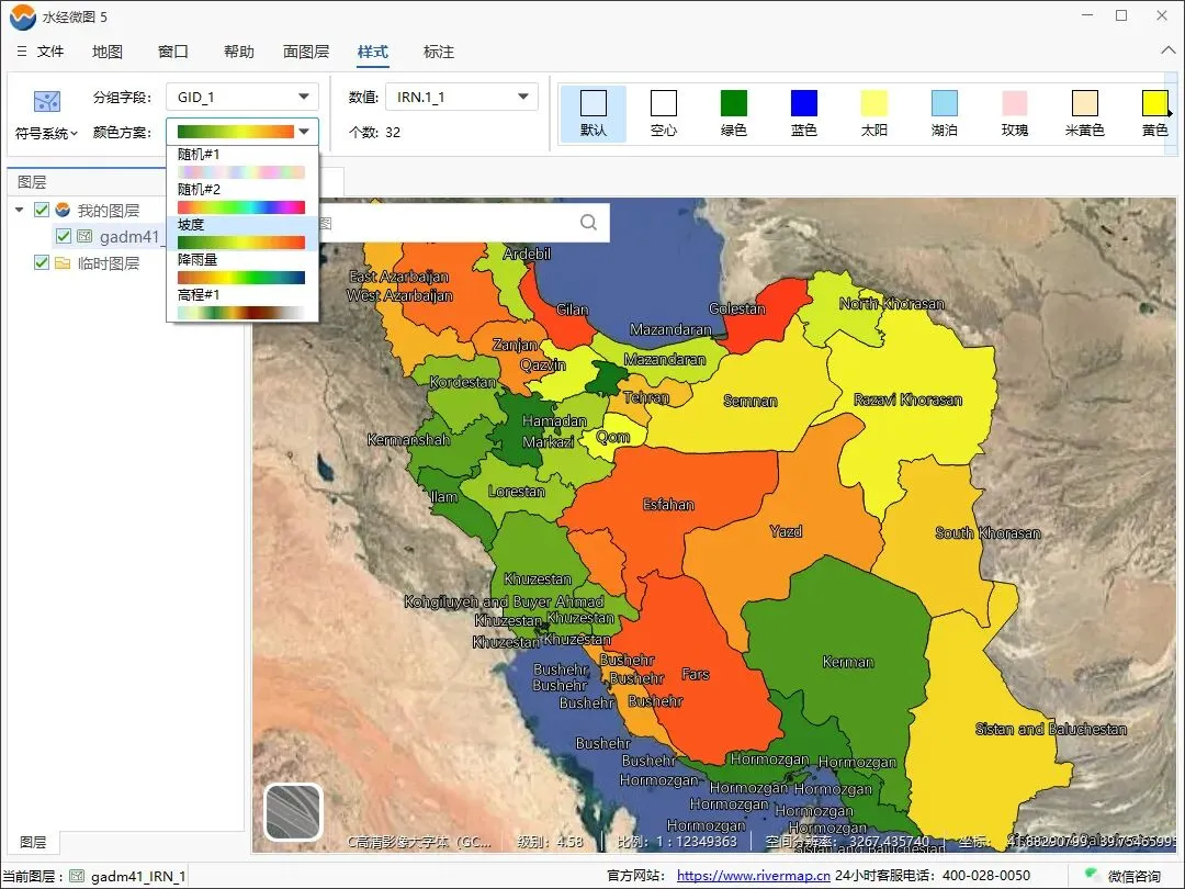 在微图中有多种颜色的配色方案,比如随机、坡度、降雨量和高程等等,效果如下图所示。