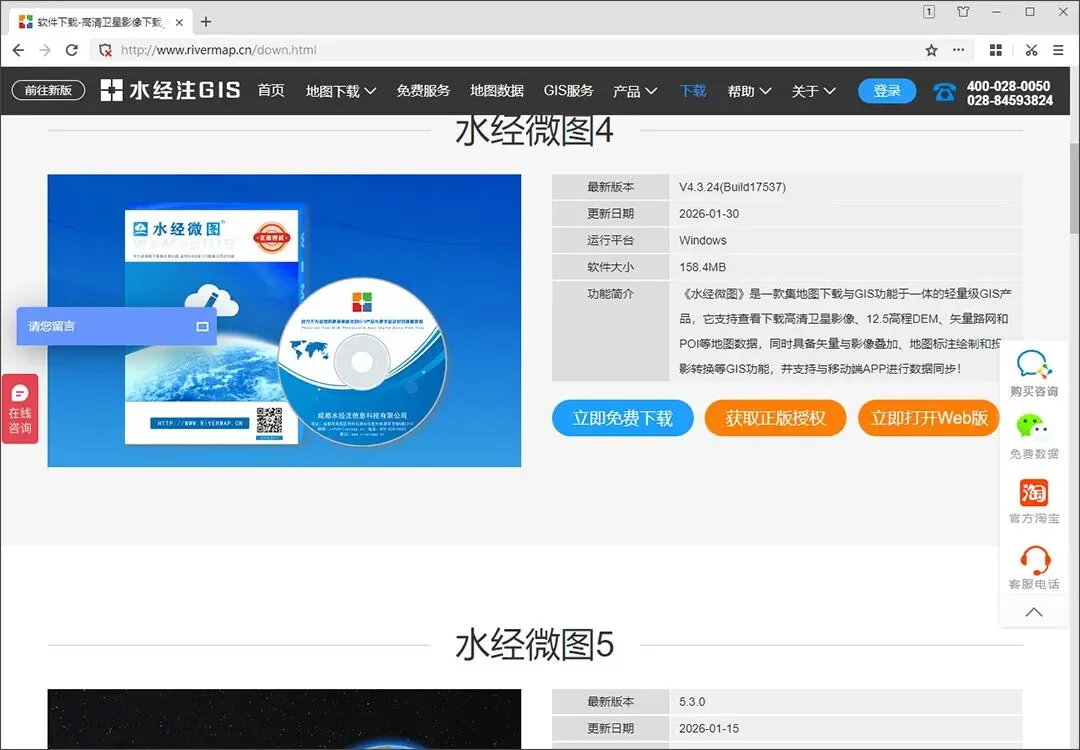 在此水经注官方网站的下载页面中,你还可以下载微图App等其GIS地图产品软件。