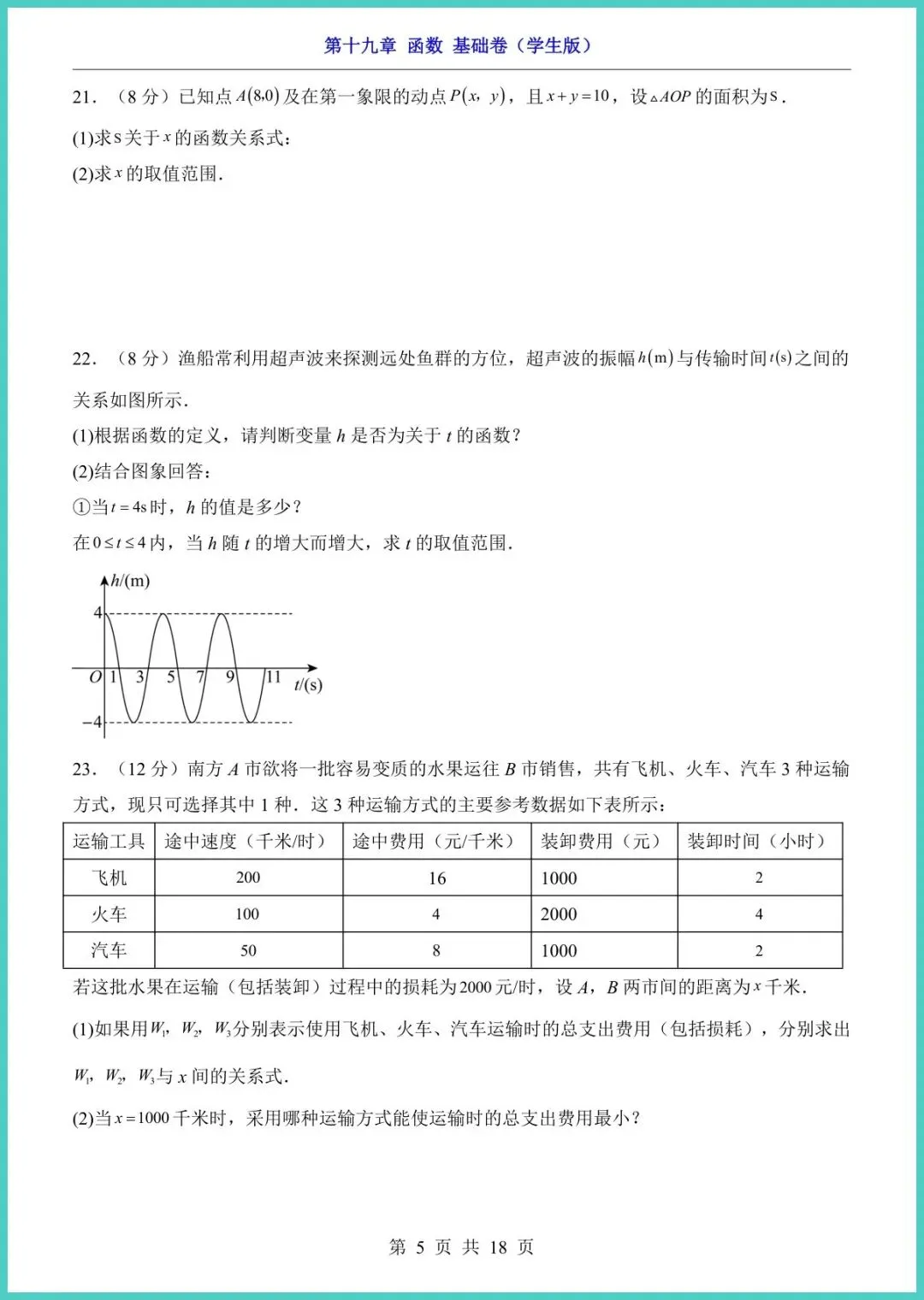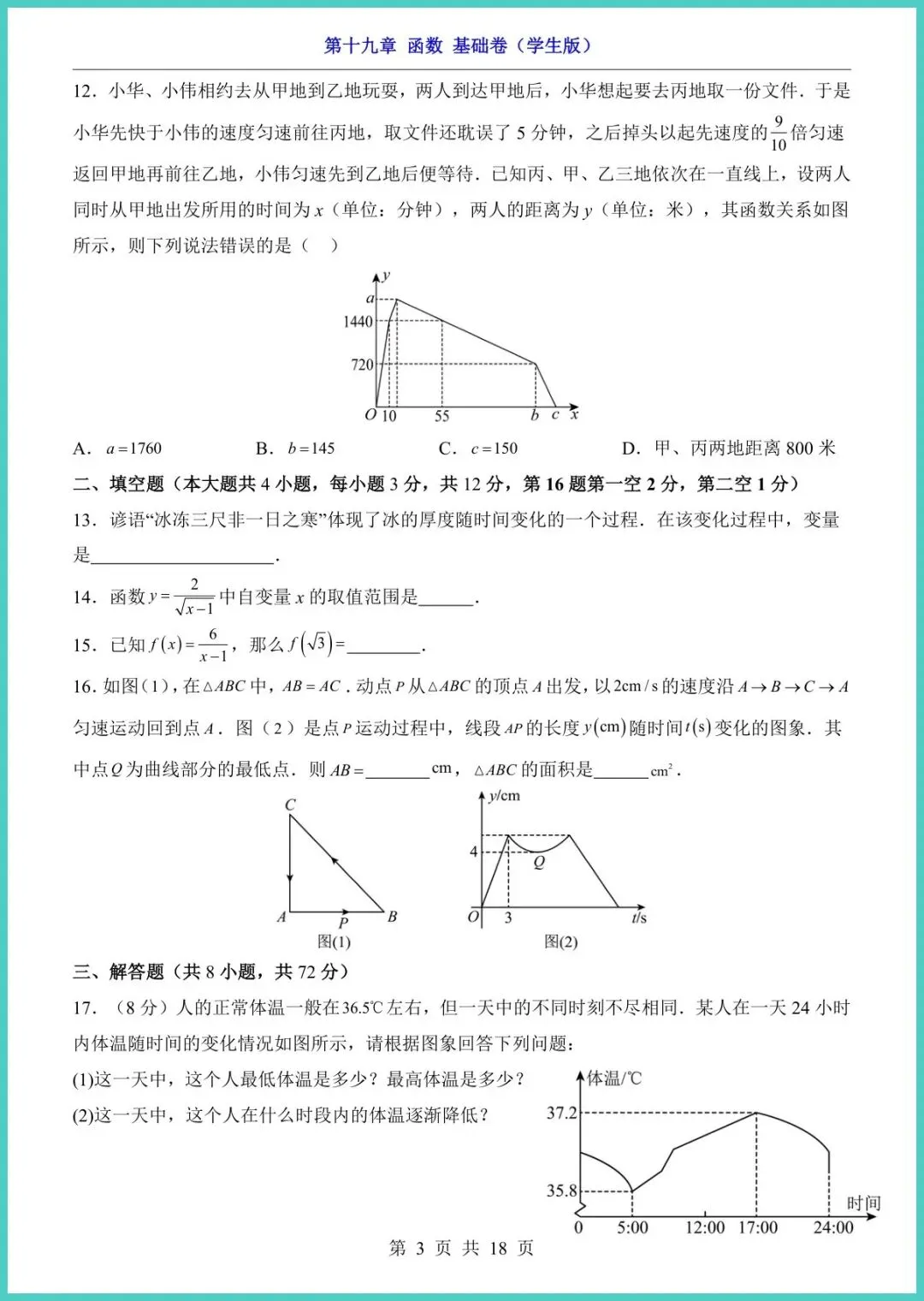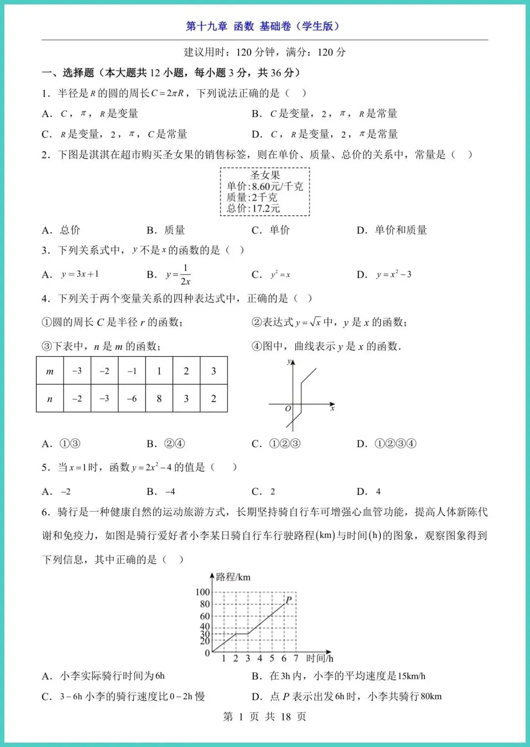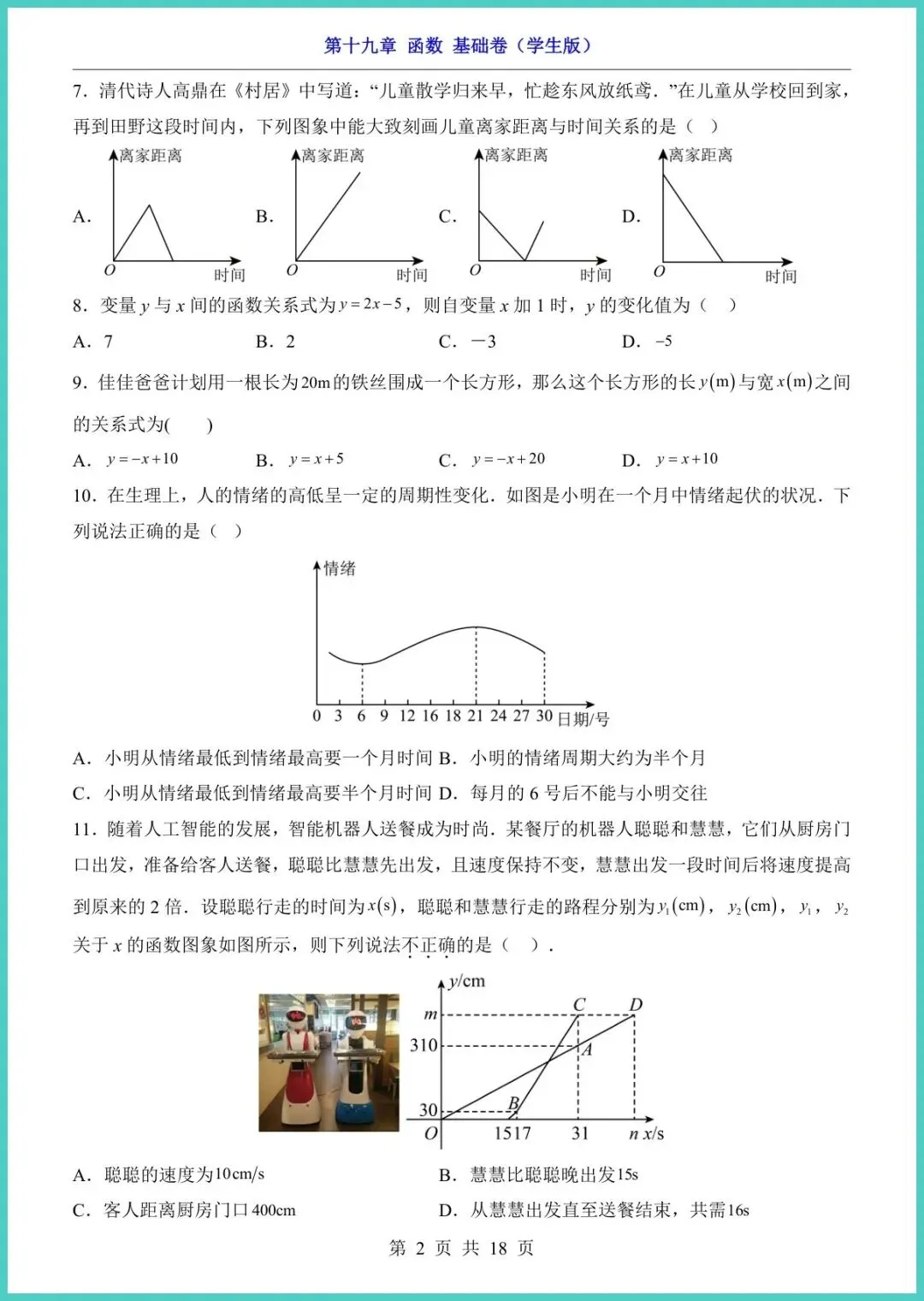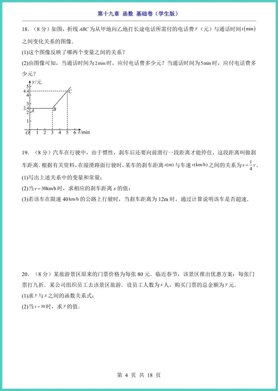 24年春冀教版八年级下册数学第19章《函数》基础卷新鲜出炉,18页满满干货,电子版一键打印!套卷紧扣课本,从变量概念、解析式书写到图像描点、实际应用题,层层递进,帮孩子把“函数”这颗钉子一次性敲牢。每题配详细思路点拨,易错点标红,做完就能自查自纠,秒懂“对应关系”,考场不再慌。想让孩子期中稳拿基础分、建立信心的家长,赶紧把这份小卷打印出来,今晚就练!
