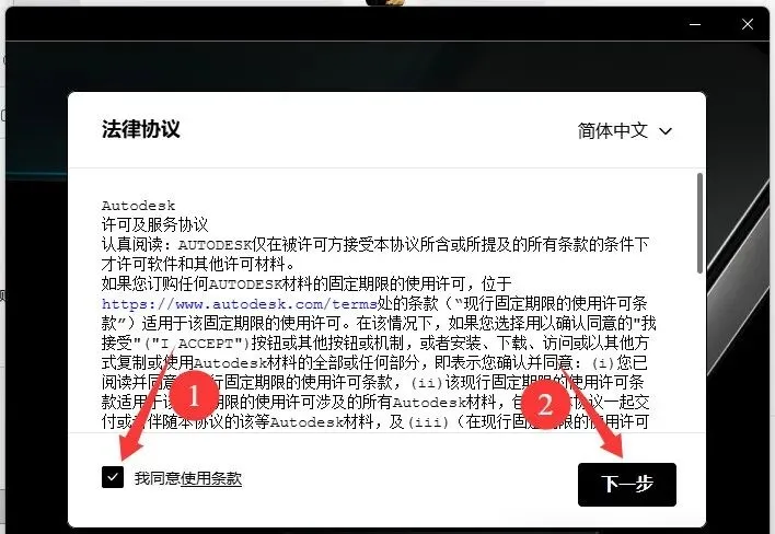 3、勾选我同意使用条款,点击下一步。
