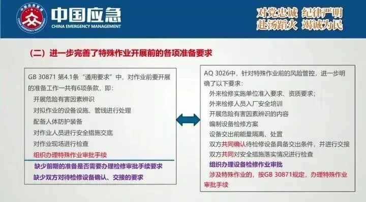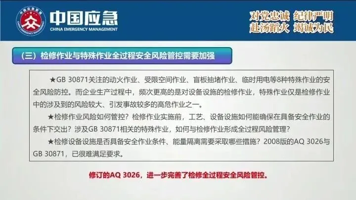 当前检修作业事故仍高发,2013—2024 年较大事故中超 56% 与检修、特殊作业管理不当相关,主要问题集中在危害辨识缺失、设备交出不达标、气体检测不规范、票证审批不严四类,其中设备未安全交出占比最高。AQ 3026-2026 在 2008 版基础上修订,与 GB 30871 形成配套:前者覆盖检修全流程,后者聚焦动火、受限空间等 8 类特殊作业,实行 “检修票 + 特殊作业票”的 1+N 审批模式。
