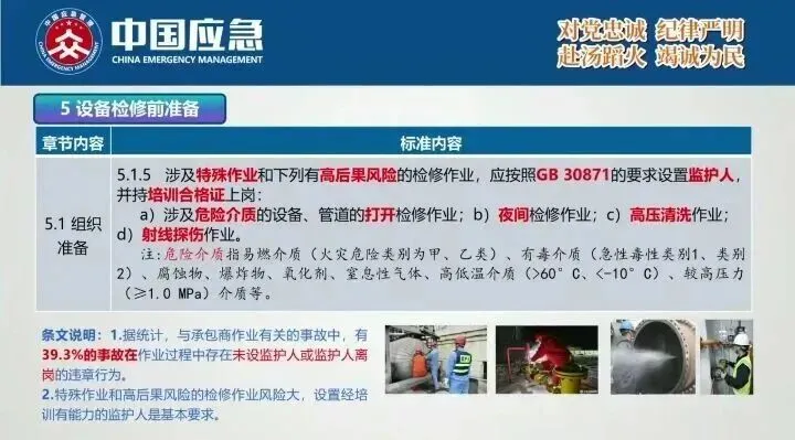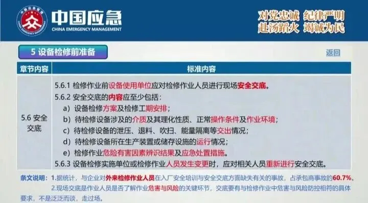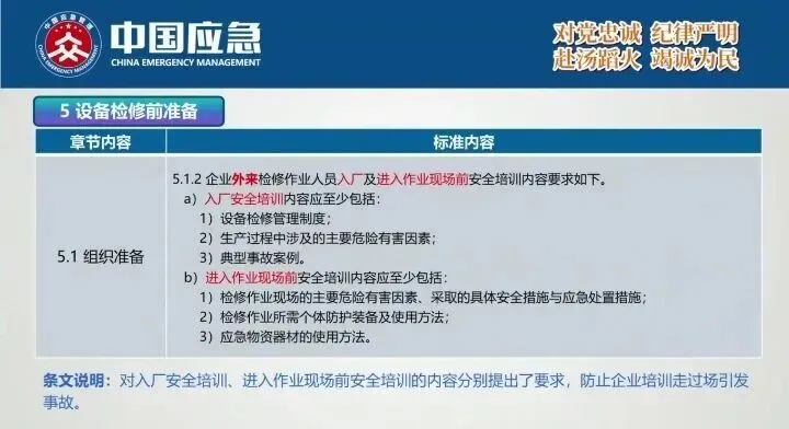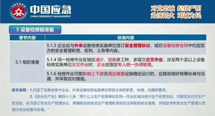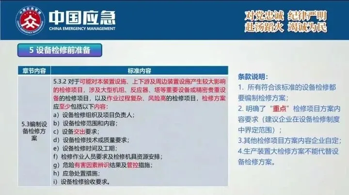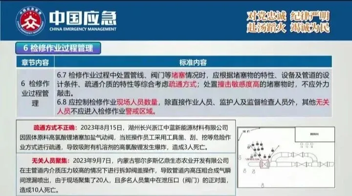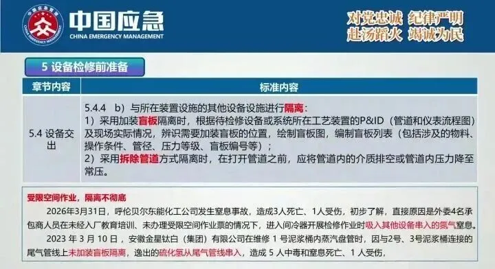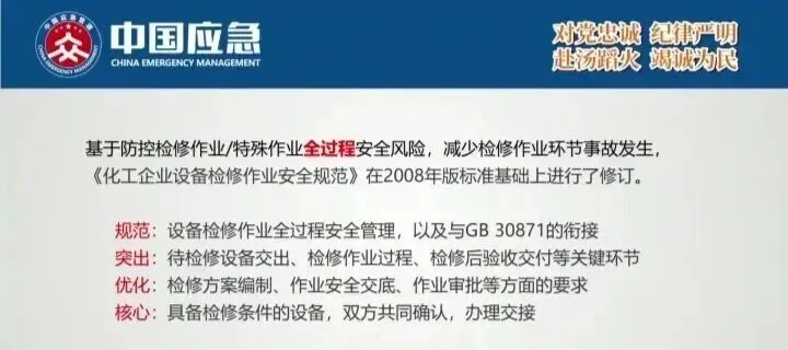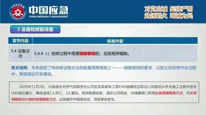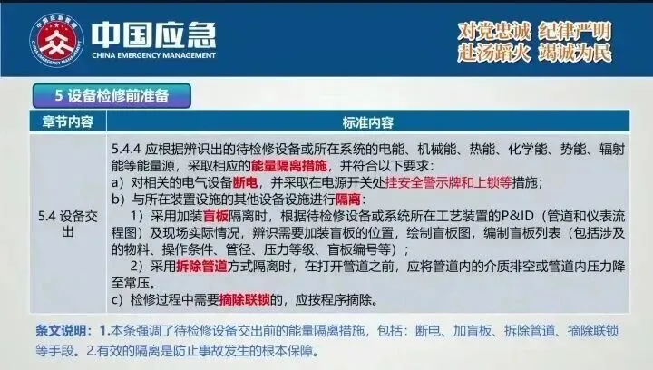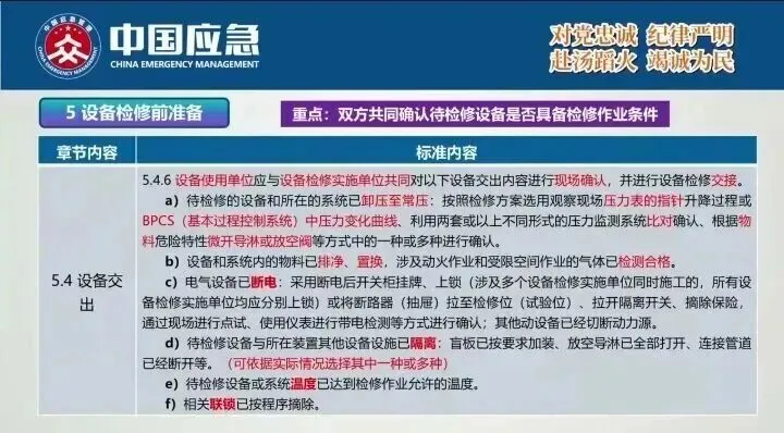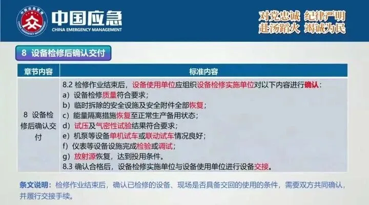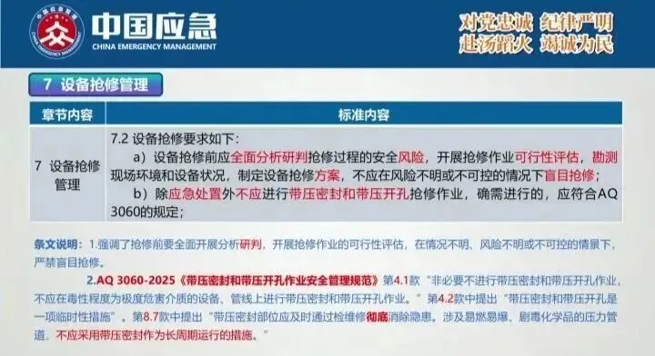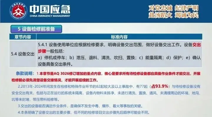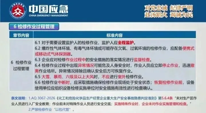 标准强化检修全过程管控:检修前落实承包商准入、人员培训、风险辨识、方案编制,重点执行设备安全交出,做到泄压、退料、清洗、置换、能量隔离(盲板 / 断电挂牌上锁),双方现场确认交接;作业中严格监护、连续气体检测、控制现场人员、规范堵塞处置;抢修严控风险与人数,禁止盲目带压作业;检修后恢复安全设施、清理现场、共同验收交接。