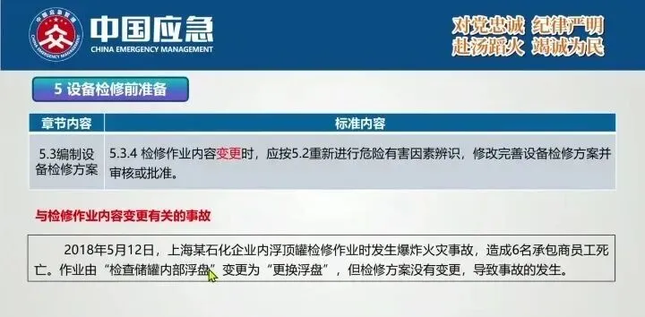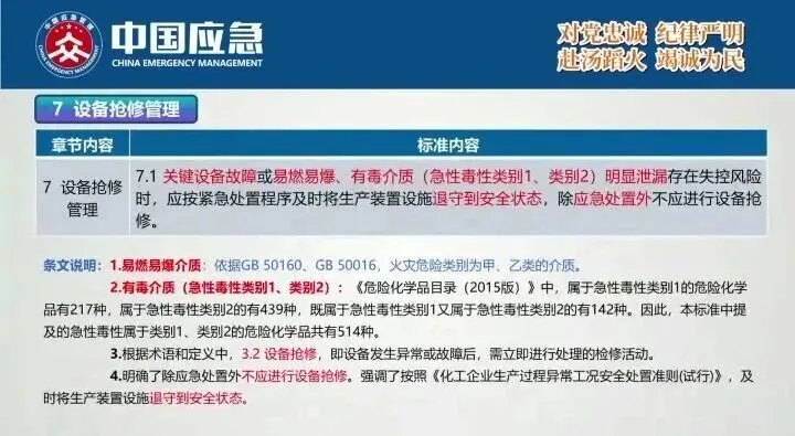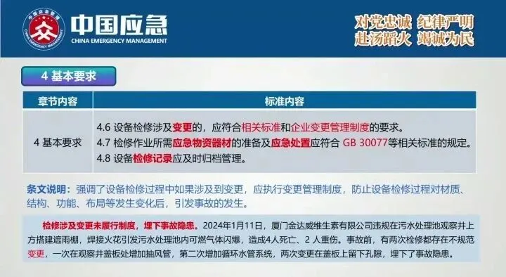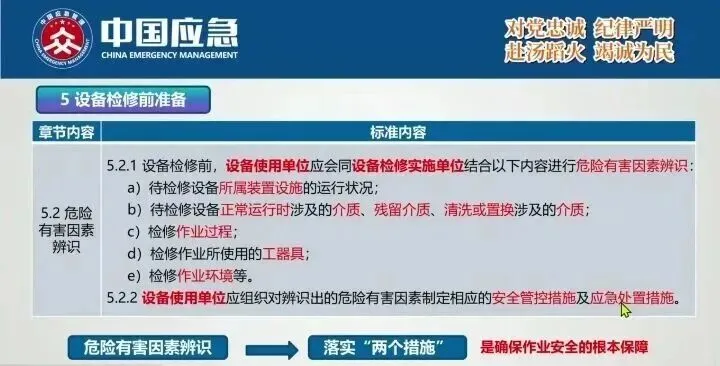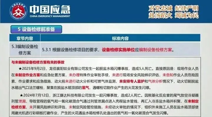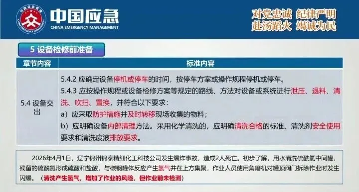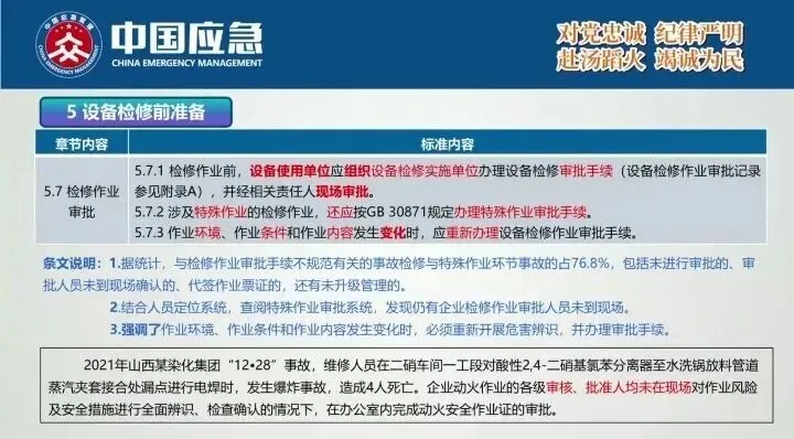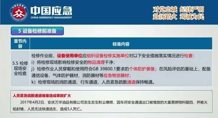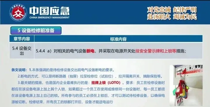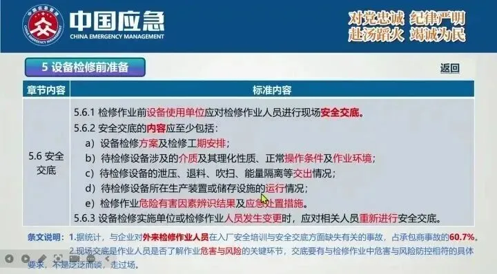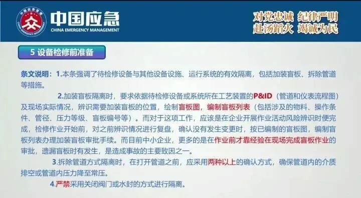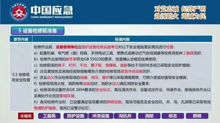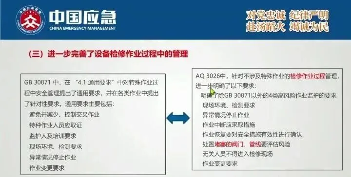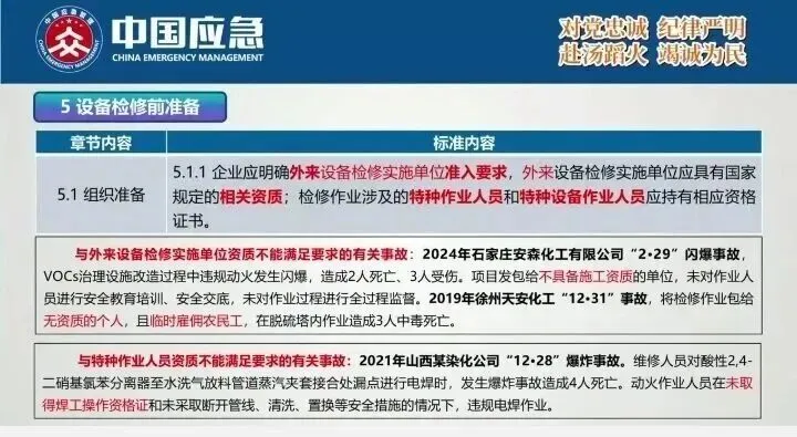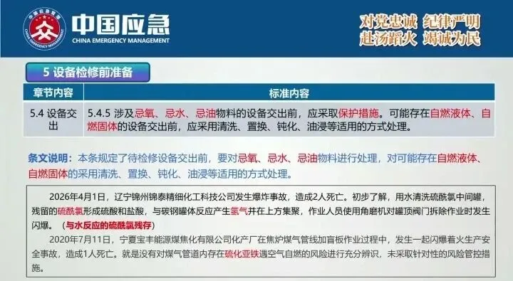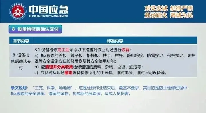 标准强化检修全过程管控:检修前落实承包商准入、人员培训、风险辨识、方案编制,重点执行设备安全交出,做到泄压、退料、清洗、置换、能量隔离(盲板 / 断电挂牌上锁),双方现场确认交接;作业中严格监护、连续气体检测、控制现场人员、规范堵塞处置;抢修严控风险与人数,禁止盲目带压作业;检修后恢复安全设施、清理现场、共同验收交接。