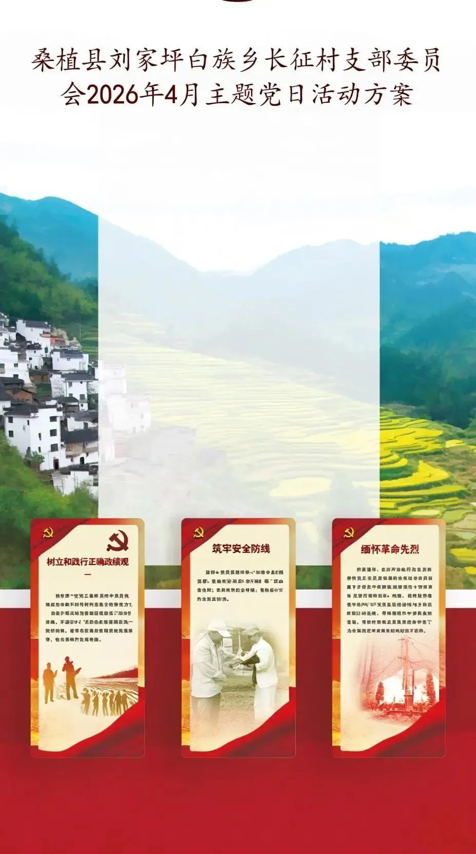 为切实开展好本月主题党日活动,确保活动“党味”浓、接地气、有实效,长征村支部委员会结合当前重点工作与农村党员实际,制定了2026年4月份主题党日活动方案。各党小组及全体党员可结合实际选择开展,鼓励在完成规定动作基础上进行创新。