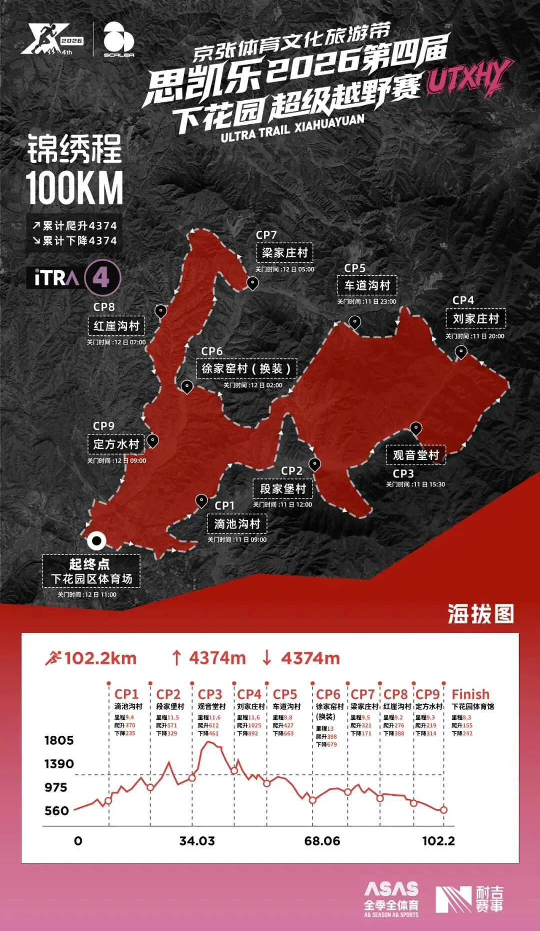 赛道描述:从观音堂村出发,穿过县道后沿机耕道缓坡前行约 1 公里,随后进入爬升较大的山野路段。登顶山脊后,沿山野小径起伏前行约 5 公里,抵达下花园登山步道木栈道。沿木栈道下行约 1 公里,再沿硬化路一路前行,抵达 CP4 刘家庄。本赛段为全程爬升最大路段,选手请提前备足补给与饮水,做好充分准备。