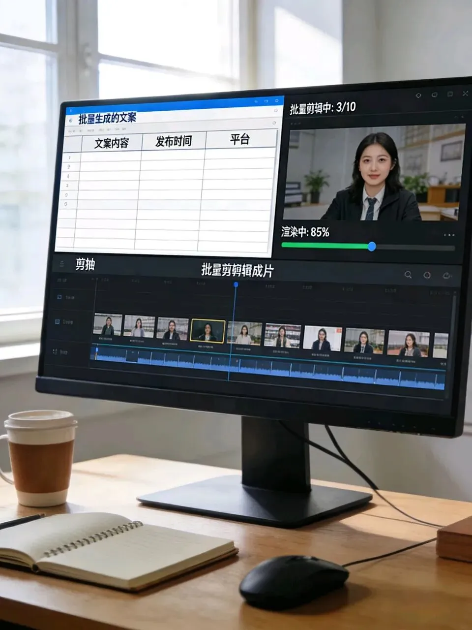 负责批量后期、自动字幕、配乐、去重、导出,解放双手。