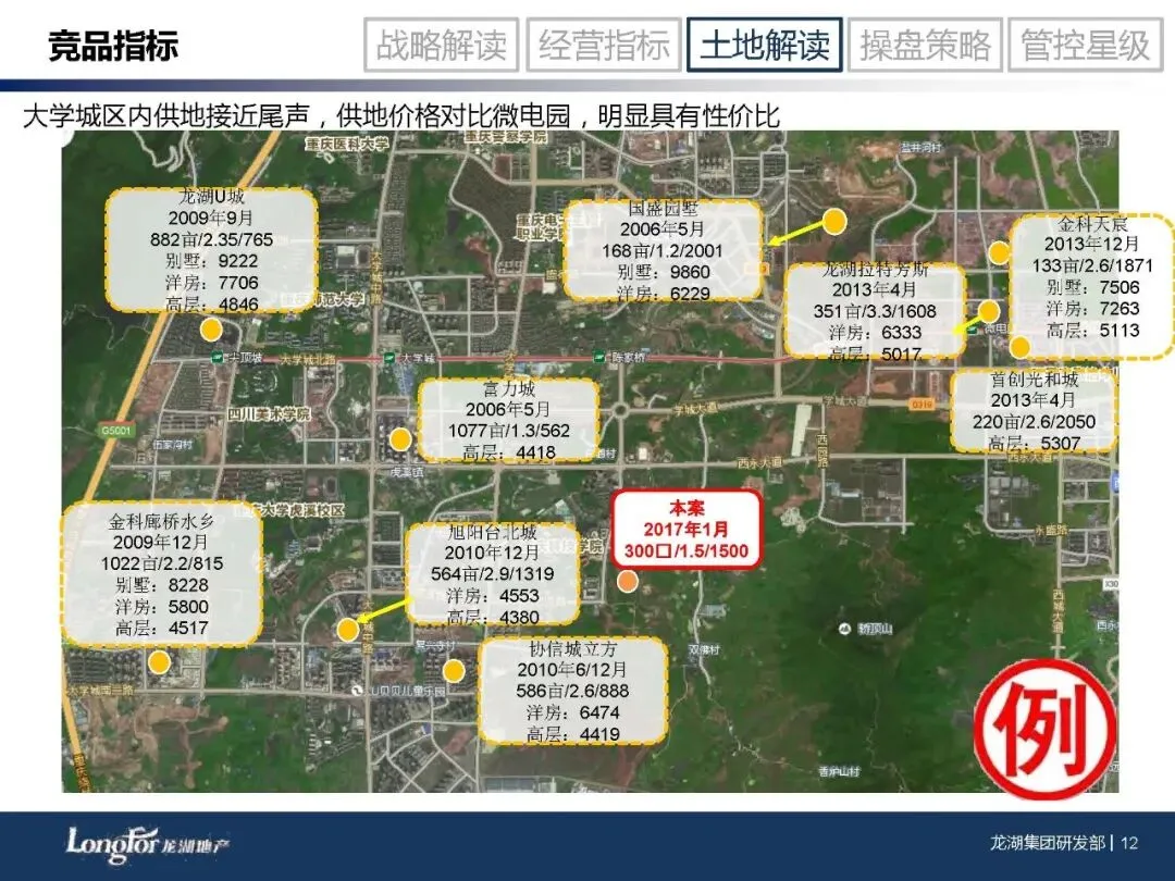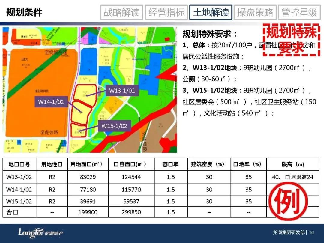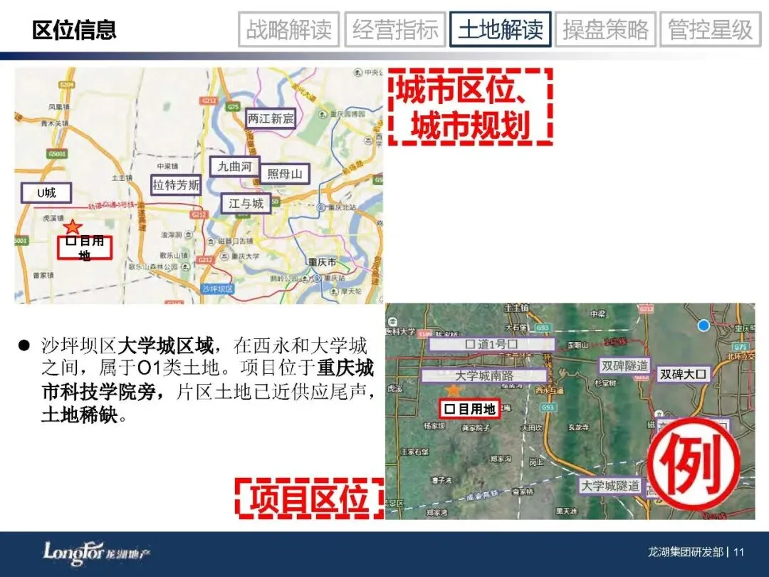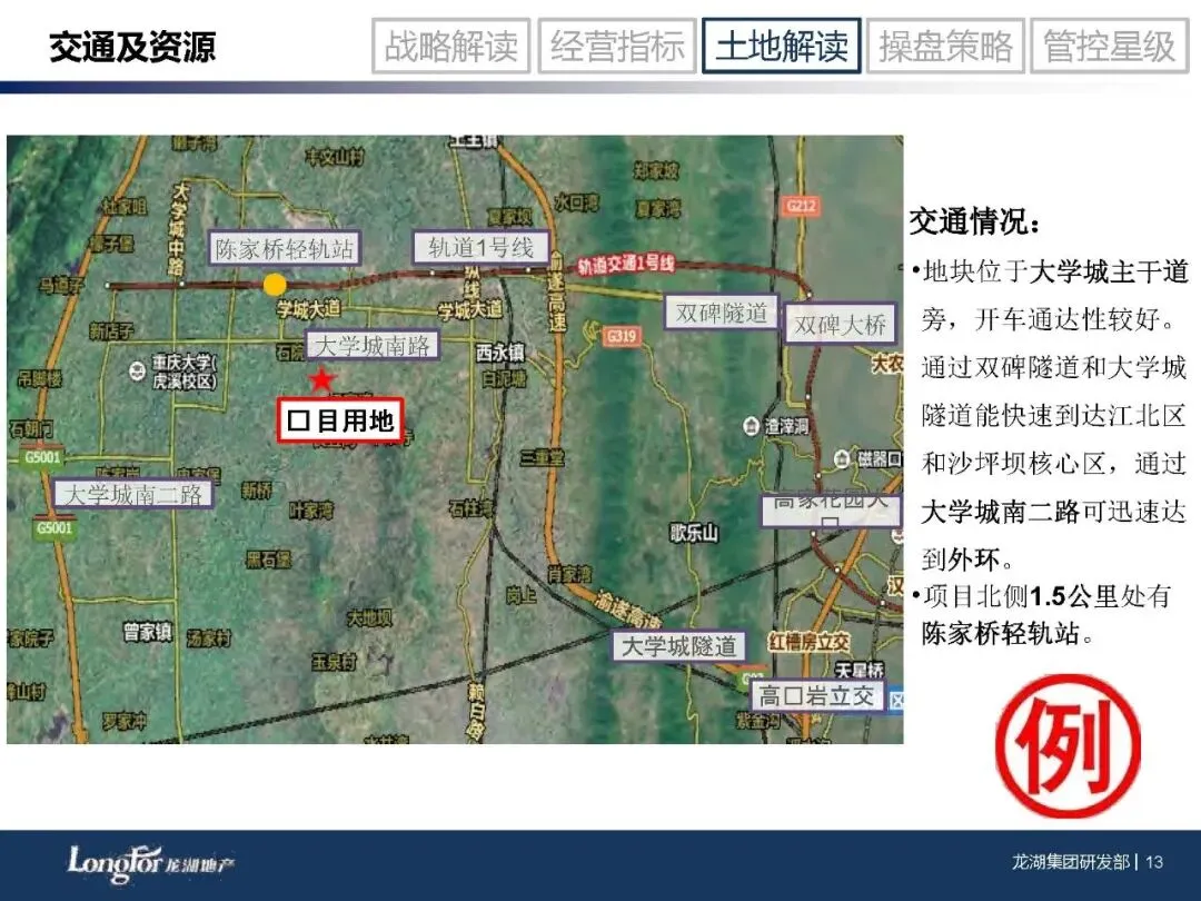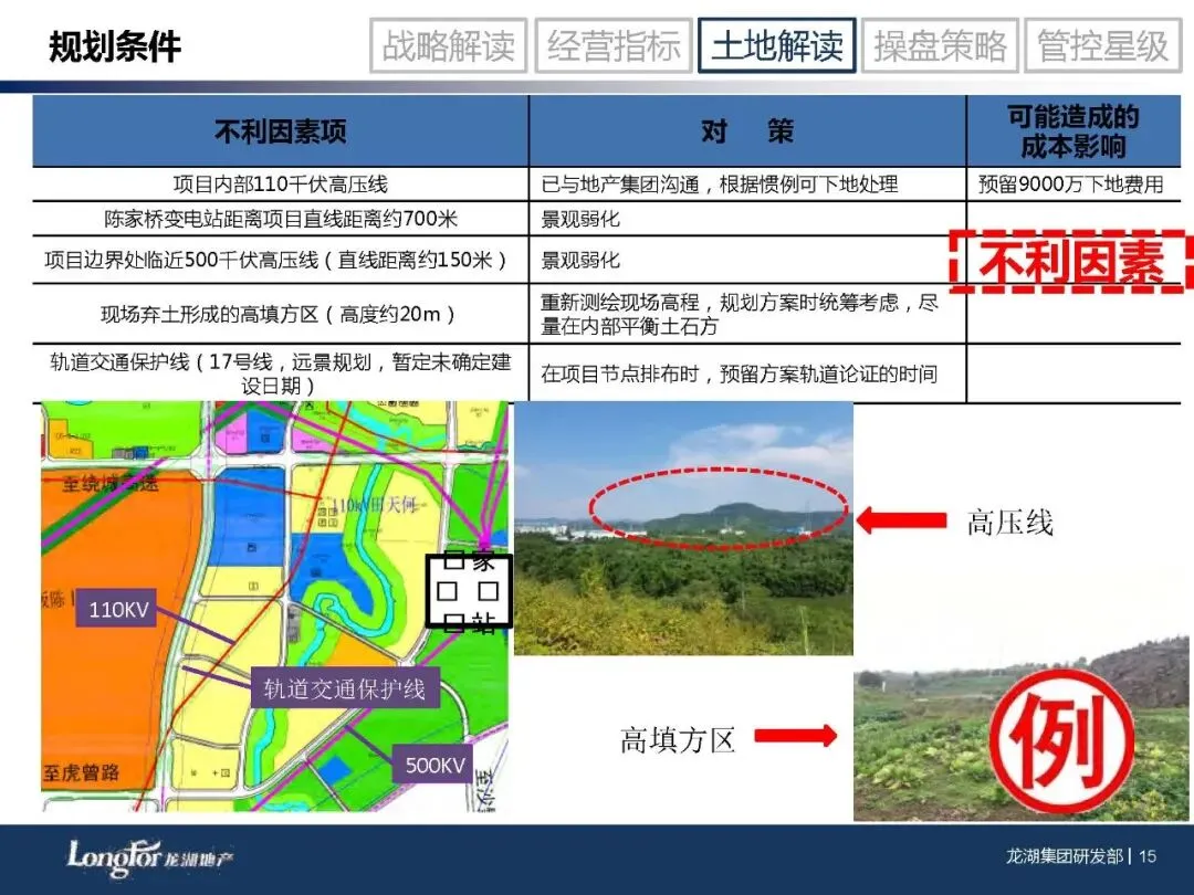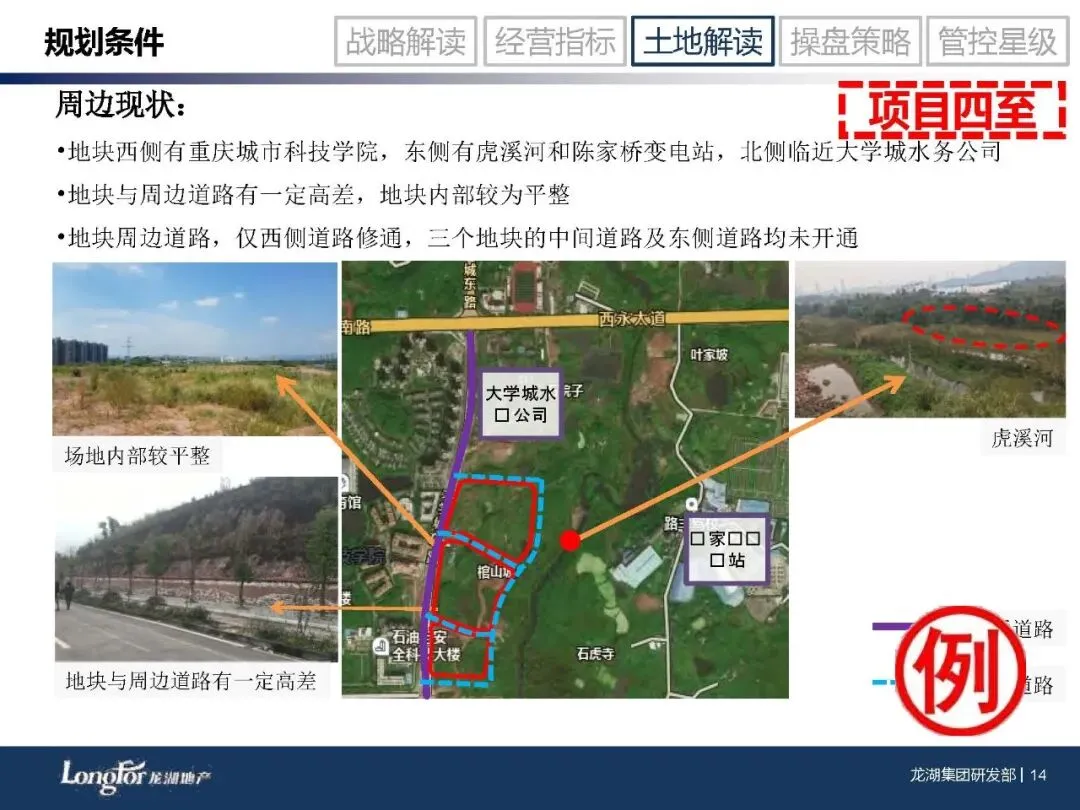 土地解读操盘策略管控星级项目四至周边现状地块西侧有重庆城市科技学院东侧有虎溪河和陈家桥变电站北侧临近大学城水务公司地块与周边道路有一定高差地块内部较为平整地块周边道路仅西侧道路修通三个地块的中间道路及东侧道路均未开通场地内部较平整虎溪河地块与周边道路有一定高差龙湖集团研发部规划条件战略解读经营指标土地解读操盘策略管控星级不利因素项对策可能造成的成本影响项目内部千伏高压线已与地产集团沟通根据惯例可下地处理预留万下地费用陈家桥变电站距离项目直线距离约米景观弱化项目边界处临近千伏高压线直线距离约米景观弱化不利因素现场弃土形成的高填方区高度约重新测绘现场高程规划方案时统筹考虑尽量在内部平衡土石方轨道交通保护线号线远景规划暂定未确定建设日期在项目节点排布时预留方案轨道论证的时间高压线高填方区例龙湖集团研发部规划条件战略解读经营指标土地解读操盘策略管控星级规划特殊要求规划特殊居民公益性服务设施总体按户