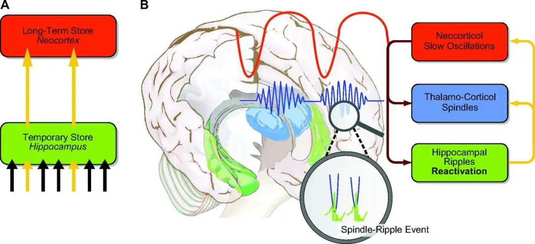 睡眠期间主动系统巩固模型。A(数据迁移): 在深度睡眠(慢波睡眠)期间,刚写入「海马体」(临时存储区)的记忆会被反复回放,从而被逐步转移并固化到「新皮层」长期存储区)中。B(传输协议): 这个数据转移过程,依赖于两个区域之间高度同步的「对话」。大脑皮层会发出缓慢的脑电波(红线)作为主控节拍。在波峰的驱动下,海马体将记忆碎片打包成高频信号(绿线处的尖波涟漪),并与丘脑发出的载波(蓝线处的纺锤波)完美配合。这就像是把高频的记忆数据,精准地镶嵌进传输通道的空隙里,确保信息被同步上传至大脑皮层。|图片来源:National Library of Medicine(United States)