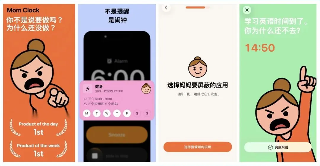 它支持临时应用屏蔽功能,到了提醒时间,妈妈会为你屏蔽开始设置的应用,帮你屏蔽干扰,你需要先把正事做好,其它的等一会儿;这个时候,你再打开屏蔽的应用,会看到一个妈妈在盯着你的界面,无法正常进入软件。