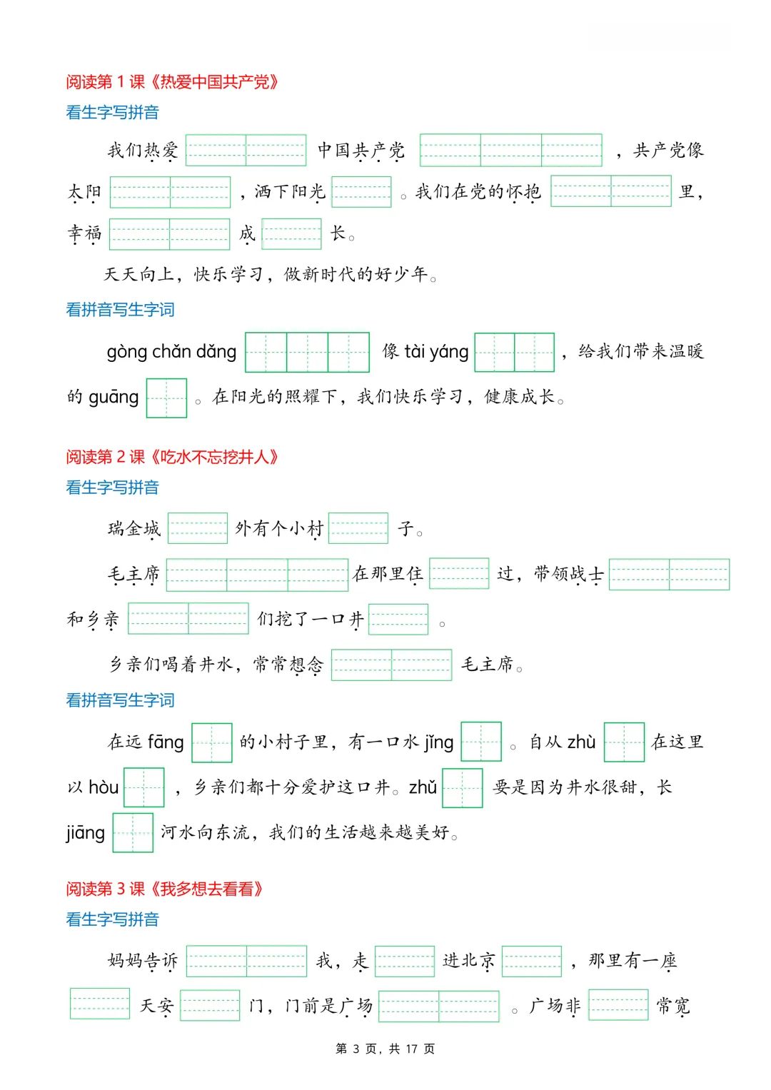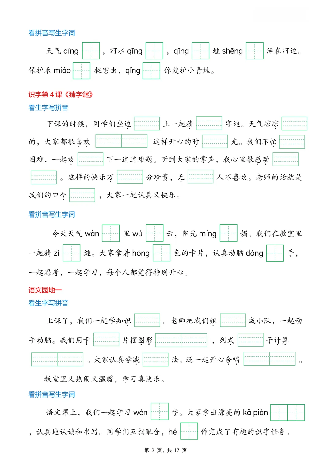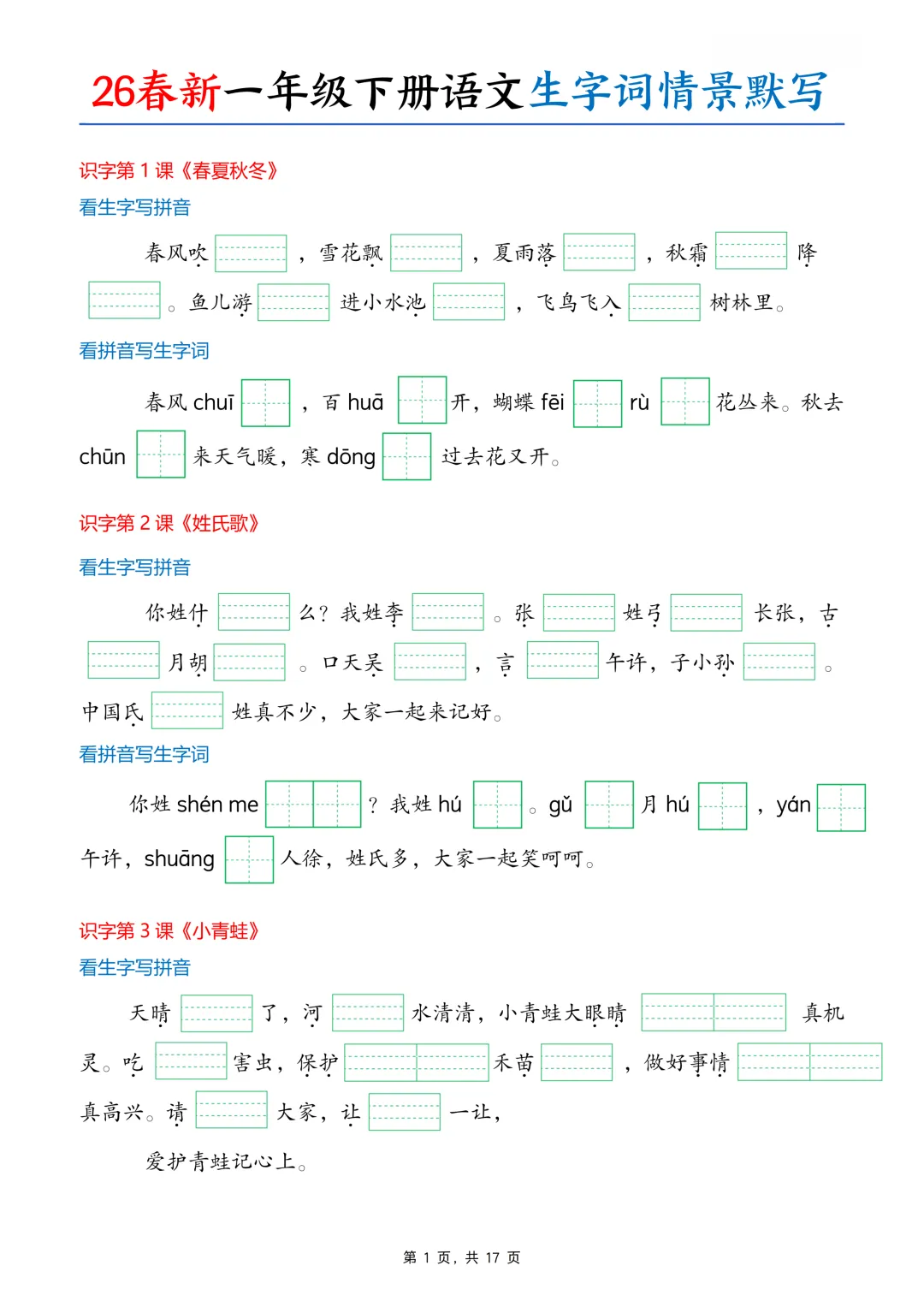 一年级下册语文生字词情境默写,可下载!每课划重点知识点总结晨读晚背词语默写单看拼音写词语课前预习卡好文仿写练笔生字手册课课帖生字帖练习1生字帖练习2生字帖练习3❗❗❗温馨提示:高清图片打印或拉到文末下载电子档资料高清无水印,全17页,展示前4页练习△因篇幅有限,只展示部分资料截图△声明:本公众号尊重原创,素材来源网络,好的内容值得分享,如有侵权请联系删除。更多资料请点击“中小学各学科上下册空中课堂、微课汇总”。▼下载完整版方式▲扫码关注小语老师 在公众号消息框(后台)回复:401资料下载视频讲解(点击观看)点击下方『阅读原文』一年级下册语文资料合集