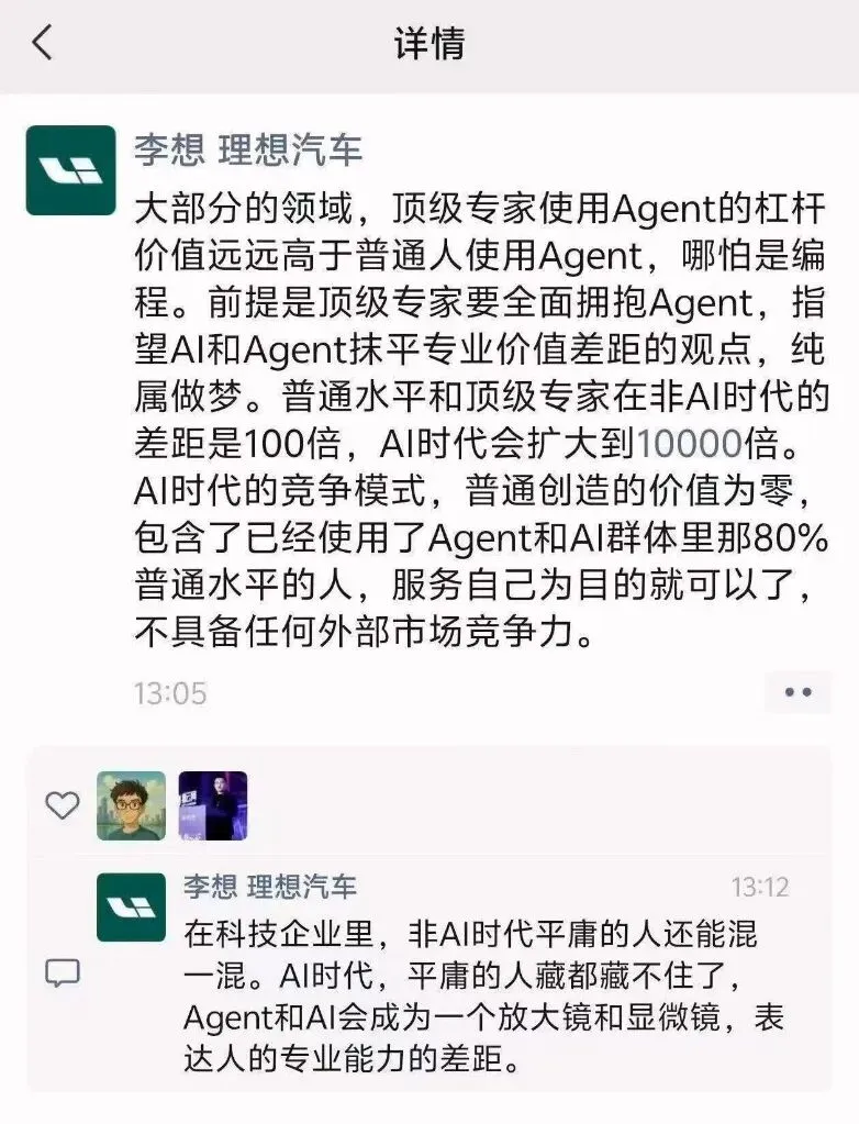 李想还提到了一个问题:AI是一把显微镜,让平庸的人藏不住。