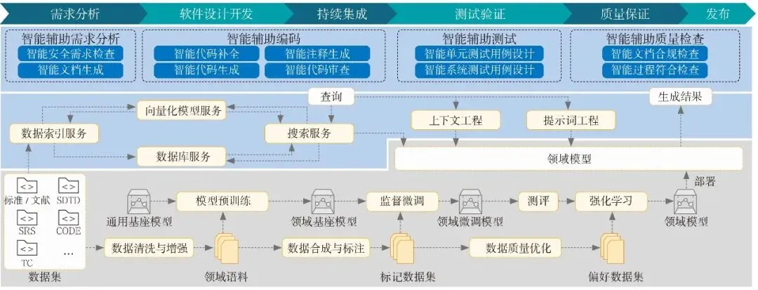 为破解上述矛盾,创新项目以“求同存异、优势互补”为原则,构建覆盖组织、项目、活动、执行细节的软件研发体系;以过程数据为主线搭建数字化工具链,实现需求、设计、编码、验证、交付的流水化自动编排与度量监控;进一步对软件资产进行结构化与数字化沉淀,并在需求、测试、评审、文档、审核监控等关键效能环节开展智能化应用攻关,形成可复用、可配置、可度量、可持续演进的工程化能力体系。