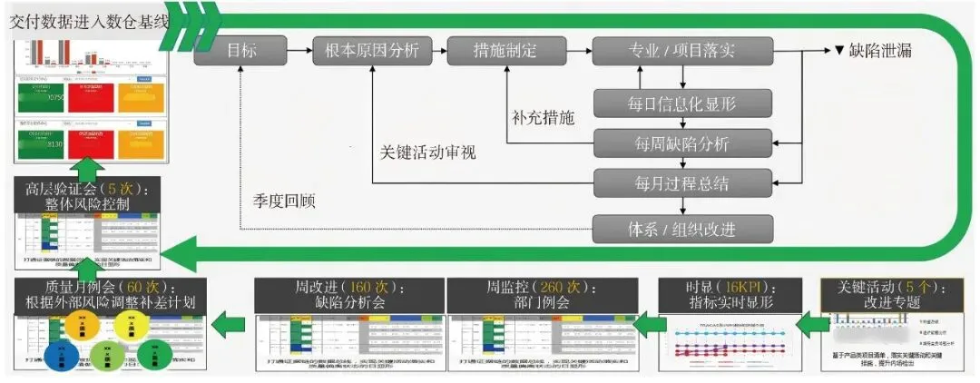 在落地实施方面,创新项目建立了“数据驱动、四级联动、闭环改进”的风险管控机制,以实时监控与定期评估相结合,形成可视化预警。通过“日—周—月—年”节奏化活动将问题从发现、定位、决策到验证固化为组织行为,每日快速同步显性化风险点;每周缺陷分析聚焦质量与难点;每月过程总结识别流程瓶颈;年度关键活动评估组织能力并规划下一阶段改进方向,确保改进“有数据、有责任、有复盘、有沉淀”。