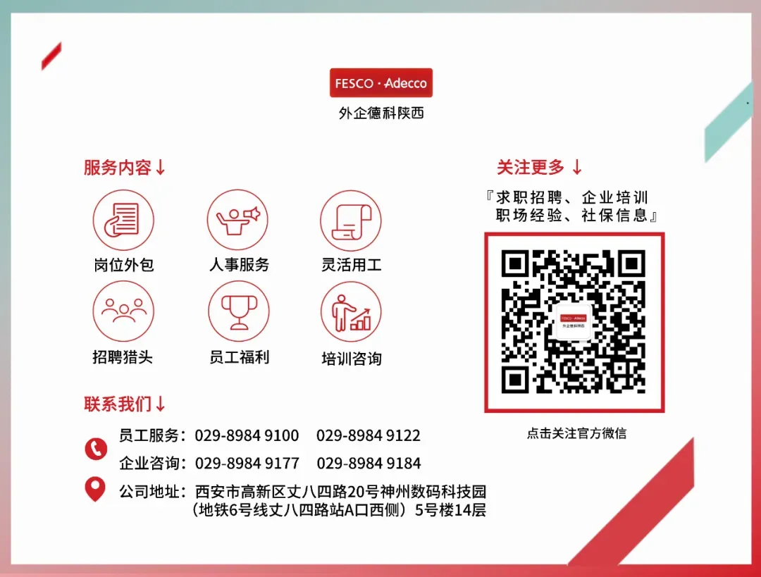 *本次招聘由外企德科陕西全程负责,概不收取应聘者任何费用,面试及结果以电话通知为准。