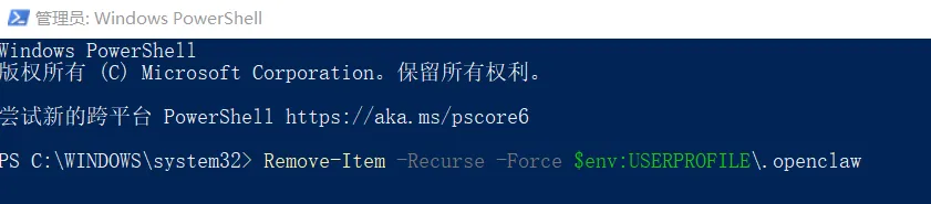 官方卸载后,会留下一些隐藏的残留目录,复制对应系统的命令,粘贴执行即可一键删除:Windows(PowerShell管理员模式):Remove-Item -Recurse -Force $env:USERPROFILE\.openclawRemove-Item -Recurse -Force $env:USERPROFILE\.clawdbot