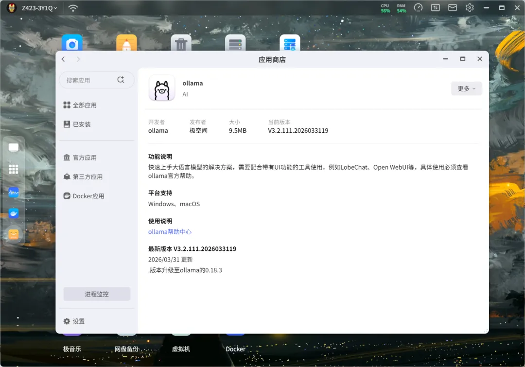 🔺本地大模型目前对于NAS玩家来说,最友好的平台应该是Ollama了。极空间现在在应用商店内已经集成了开箱即用的Ollama框架,并且还一直在维护。前两天的外测固件升级还顺便将Ollama版本更新到最新的0.18.3版本。