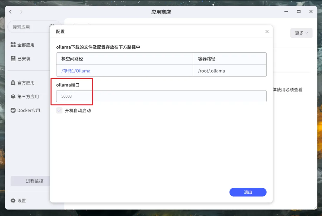 🔺我们在应用商店安装Ollama唯一需要记住的就是它的端口号就可以了。