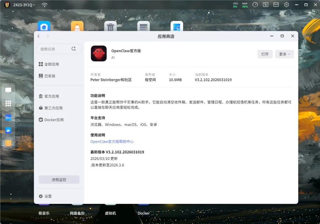 🔺同时极空间应用商店里同样有开箱即用的OpenClaw,但是版本还停留在v2026.3.8版本。截止目前小龙虾已经升级了多个版本,并且还进入了很多新的功能,比如对于Ollama插件的原生支持就是新功能之一。
